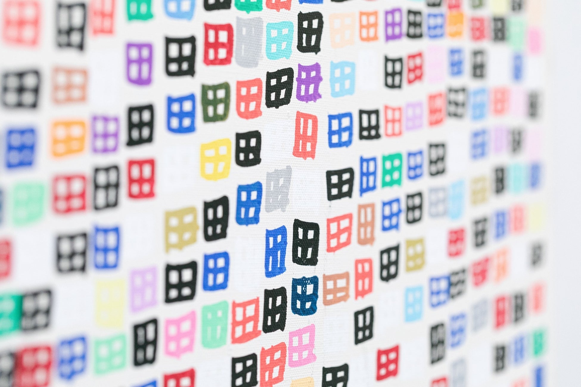 双子の渡邊直貴と渡邊昌貴は、互いに影響を与え高め合う関係です。両者ともポップでカラフルな画作りを得意としており、純粋な図形を細かく連ねて、均一化された近代社会の様相を描き出します。