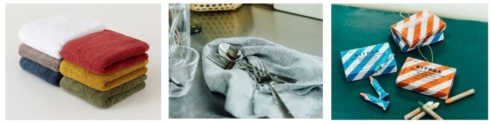 左:FLUFFY TOWEL(フラッフィータオル)ブランドイメージの落ち着いた色合いバスタオル、フェイスタオル。土壌・水質・農薬などの面で環境へ配慮した農園の綿花を使用し、タオルに仕上げる行程での電力は98%を太陽光電力でまかなう工場を選定するなど、「品質」だけでなく「サステナビリティ」にもフォーカスした商品づくりを行いました。2024年3月発売の新商品。
