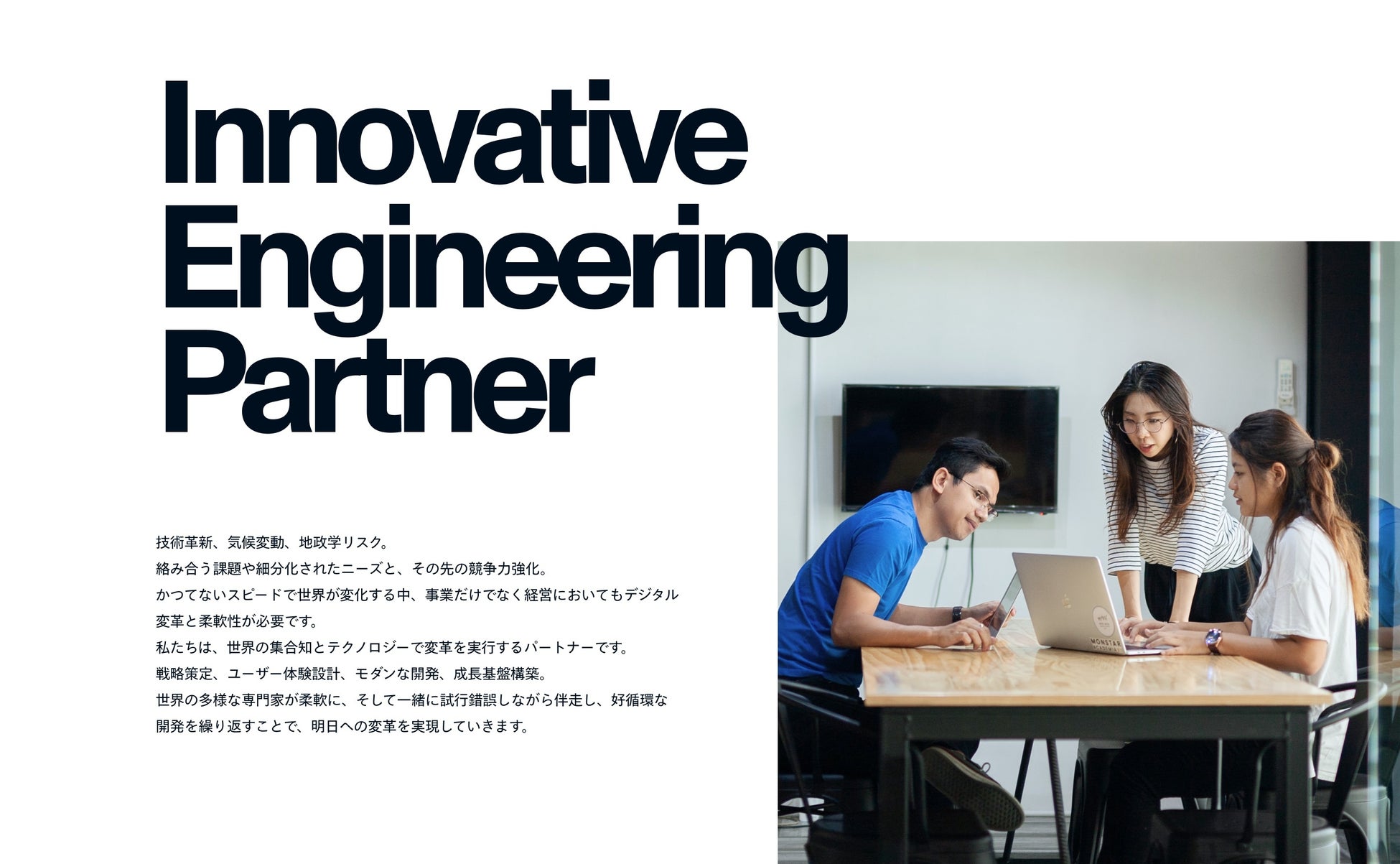 ブランドコンセプト『Innovative Engineering Partner』を冠し、モンスターラボの持つ機能や価値、サービスを明確かつ分かりやすく表現しました。