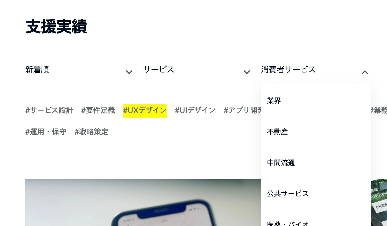 サービス・業界などのフィルタに加え、実際のプロジェクトに活用されたソリューションのタグを設置することで、実績の検索性が向上しました。