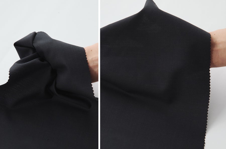 今回のタスマニアウール生地は、経糸も緯糸も双糸を使うことで、しっかり感とシワのなりにくさを確保しています。