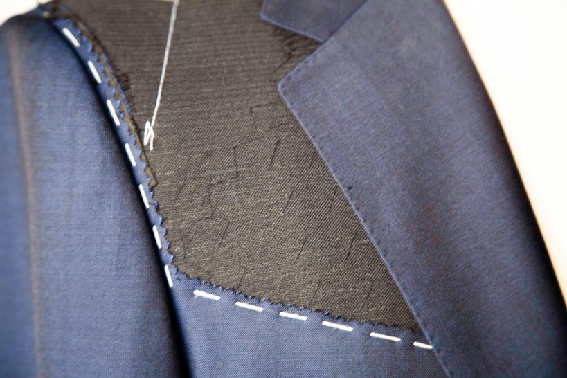 この“芯”は動物の毛を使った「毛芯」で「フル毛芯仕立て」と呼ばれる高級仕様。安いスーツは毛芯が使われていないものがほとんどです。この毛芯のおかげで胸のハリが非常に美しく出ます。