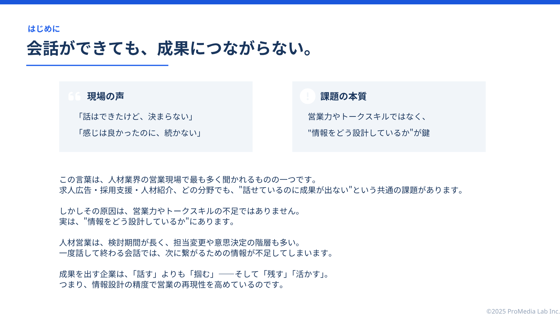 株式会社プロメディアラボ(本社:東京都中央区、代表取締役:廣瀬義憲)は、人材業界の営業・インサイドセールス組織における「話せても決まらない」課題を構造的に整理した資料『話はできたのに、次につながらない ― 人材営業の“情報設計”を変える ―』を公開しました。
