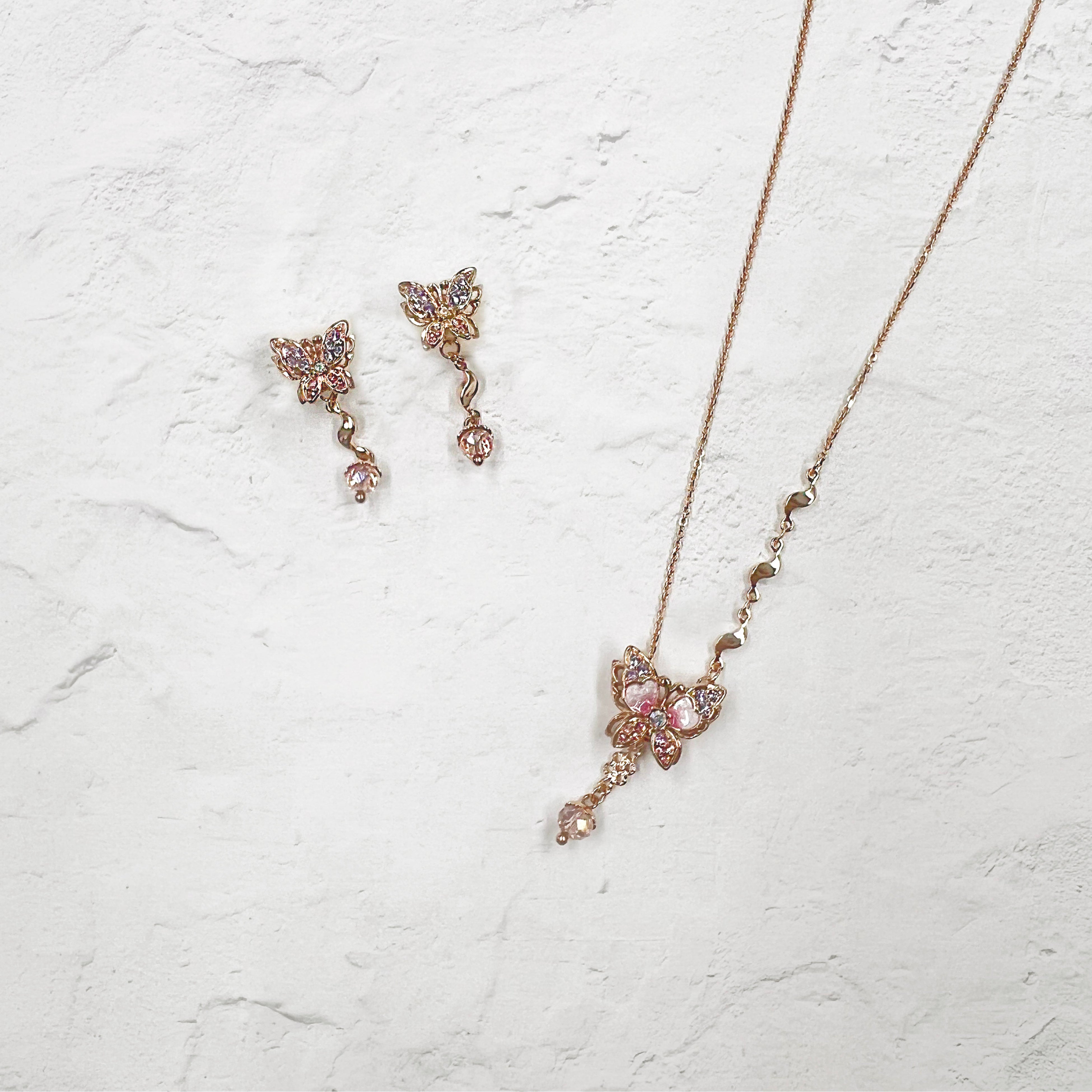 蝶は幸運を運ぶラッキーモチーフとも言われ、肌なじみの良い優しいピンクゴールドカラーと煌くカットガラスが華やかな女性らしさを演出してくれます。