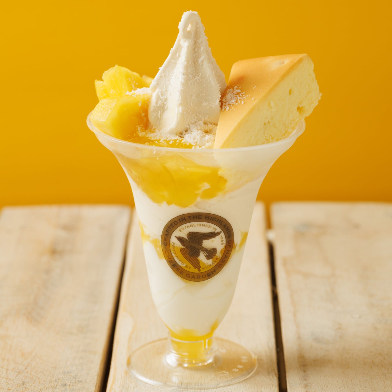 やさしい甘さとなめらかな食感の杏仁豆腐に、果肉感あるパイナップルジュレとベイクドチーズケーキ風味のチーズケーキソフトを重ねました。上には『御用邸パイナップルチーズケーキ』とカットパイナップルをのせ、パイナップルジュレとココナッツファインをトッピングいたしました。パイナップルの酸味とチーズケーキソフトのコクが、チーズケーキの味わいを引き立て、ココナッツの風味が香り立つ、トロピカルな味わいが口の中にひろがります。