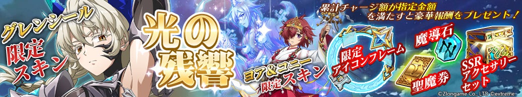 『光の残響』は累計チャージ額が指定金額に達すると、そのチャージ額に応じた報酬を獲得できる期間限定イベントです。限定アイコンフレームや聖魔券、魔導石、SSRアクセサリーセットなど、豪華報酬を獲得することができます。
