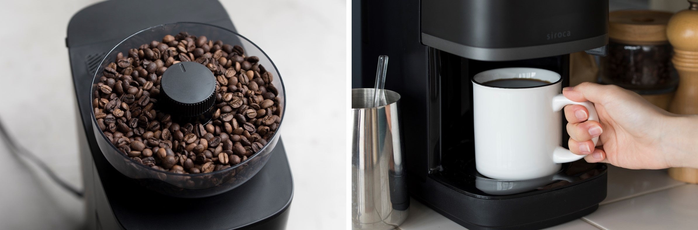 シロカのコーヒーメーカーは、発売以来、多くのお客様にご愛顧いただいているシロカの人気製品です。2019年に発売した「全自動コーヒーメーカー カフェばこ」は、“挽く・蒸らす・淹れる”が全自動で、手軽に本格的なコーヒーが楽しめる点に加え、コンパクトなサイズ感とキッチンになじむデザインに好評をいただいています。