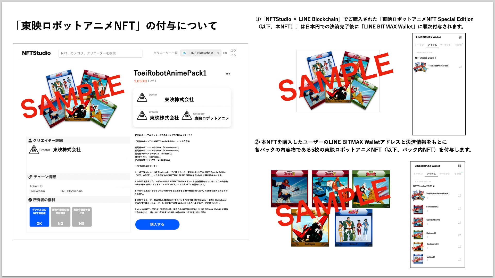 1.「NFTStudio × LINE Blockchain」でご購入された「東映ロボットアニメNFT Special Edition(以下、本NFT)」は日本円での決済完了後に「LINE BITMAX Wallet」に順次付与されます。