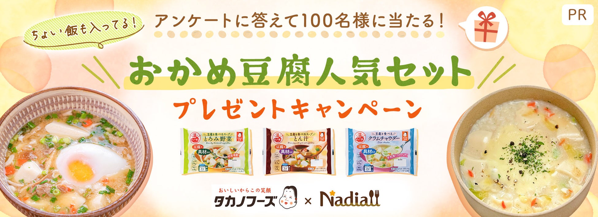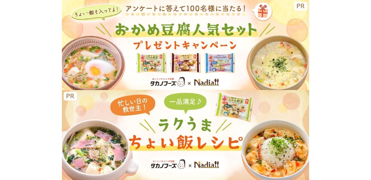 Nadia株式会社(東京都港区/代表取締役社長 葛城嘉紀 以下「Nadia」)とタカノフーズ株式会社(茨城県小美玉市/代表取締役社長 髙野成徳 以下「タカノフーズ」)がタイアップし、“豆腐と食べるスープ”「ちょい飯」の認知・消費拡大を目的に、プレゼントキャンペーンの実施と特別企画ページの公開をいたします。プレゼントキャンペーンでは「ちょい飯」に関するアンケート調査を実施し、「ちょい飯」商品そのものの認知拡大を図ります。加えて、特別企画ページ内でNadia Artistのアレンジレシピを掲載することでユーザーの消費拡大にも貢献いたします。
