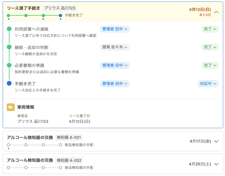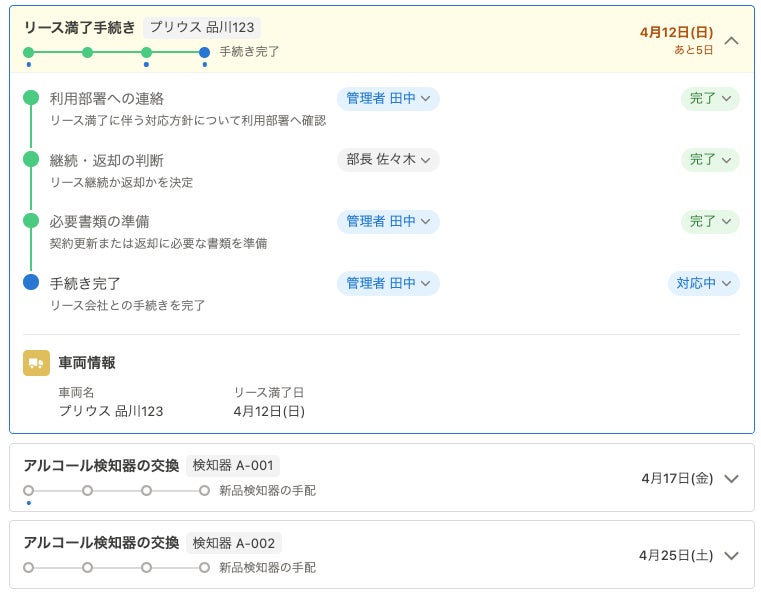 「どの車で何が起きたか」「誰が対応中か」を直感的に把握できるレイアウトに変更しました。