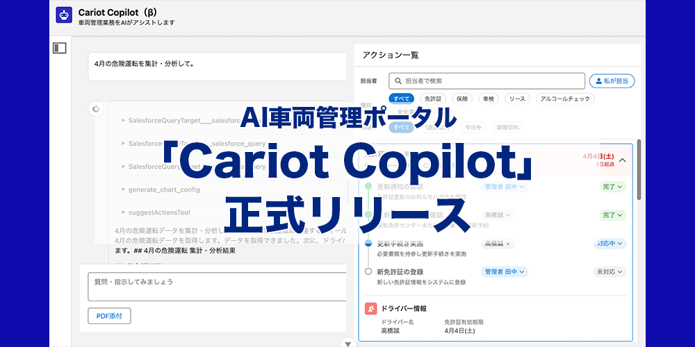 株式会社キャリオット(本社:東京都港区、代表取締役社長 齋藤 洋徳)がサービス展開する車両管理システム「Cariot(キャリオット、以下Cariot)」は、AI車両管理ポータル「Cariot Copilot(キャリオット コパイロット)」を正式リリースしたことをお知らせします。
