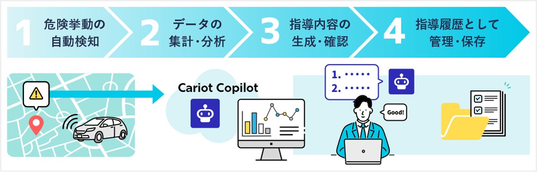 今回の「Cariot Copilot」正式版では、AIがただデータを集計するだけでなく、「何をすべきか」の判断や「ドライバーへの指導内容の作成」といった、これまで人が頭を悩ませてきた付加価値の高い業務もサポートします。管理者が迷わずに次の具体的なアクションを起こすための仕組みを整え、車両管理の負担の根本解消を目指します。