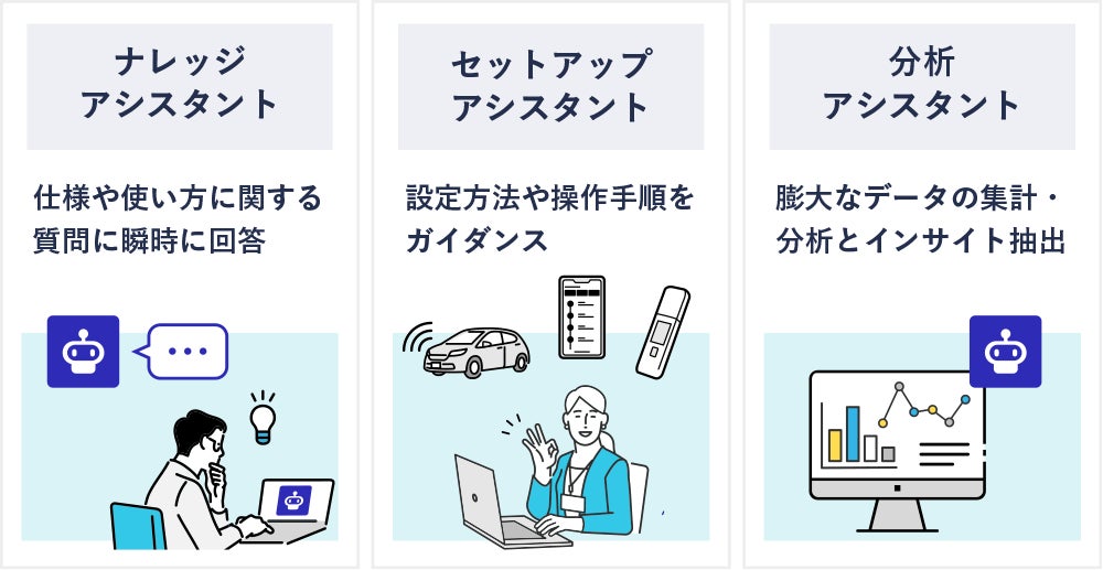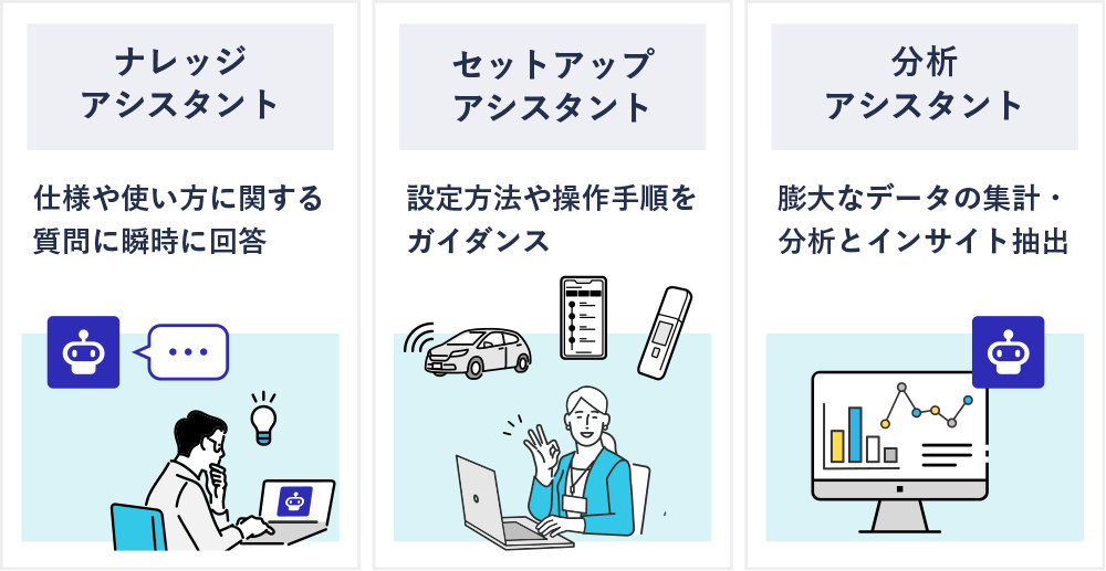 Cariot Copilotは、誰もが「使いこなせるAI」として、複雑な初期設定やデータ分析といった車両管理担当者の業務負担を軽減します。まるで「もう一人の担当者」がそばにいるかのように実務に寄り添い、強力にバックアップします。その核となるのが、役割の異なる3つのアシスタント機能です。