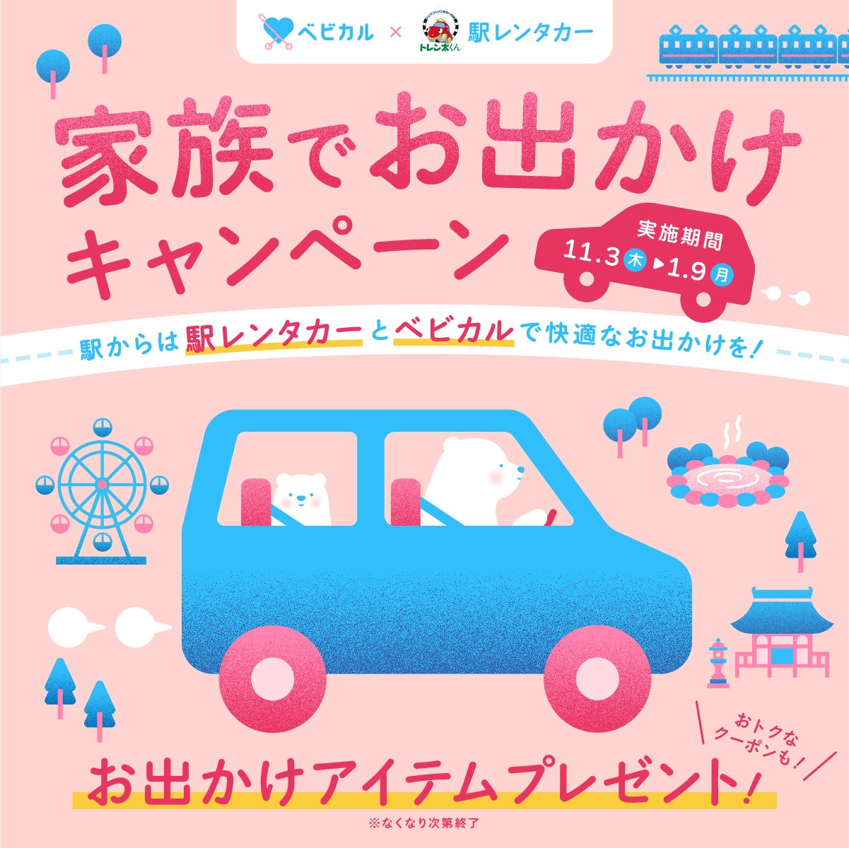 「家族でお出かけキャンペーン ~駅からは駅レンタカーとベビカルで快適なお出かけを!!~」