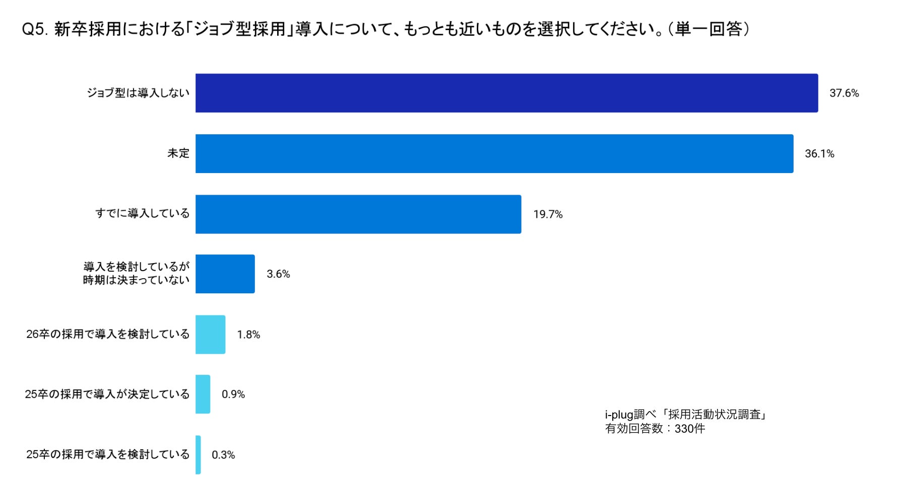 企業を対象に実施した「ジョブ型採用」の導入に関するアンケートでは、「導入しない」と回答した企業が最多の37.6%、次いで「未定」と回答した企業は36.1%でした。
