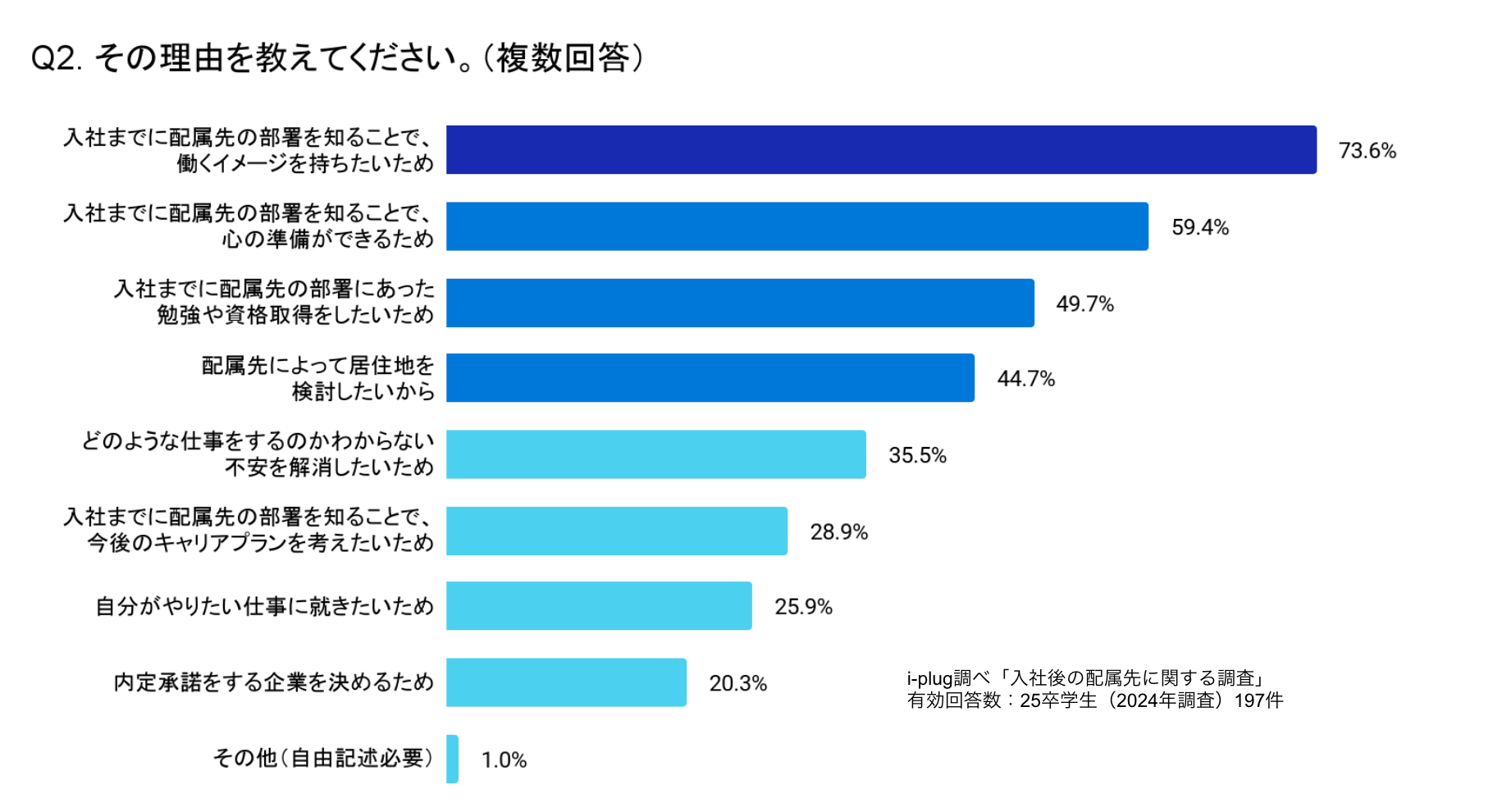 「入社までに配属先の部署を知ることで、働くイメージを持ちたいため」が最多の73.6%、次いで「入社までに配属先の部署を知ることで、心の準備ができるため」が59.4%でした。入社までに、できる限りの心づもりをしておきたい25卒学生が多いことがわかります。