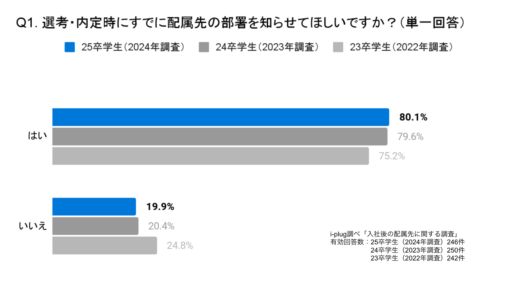 80.1%の学生が「はい」と回答しました。これまでの同様の調査結果と比較して、昨年の24卒学生から0.5ポイント、一昨年の23卒学生から約5ポイント増加しています。選考・内定時に配属先を知りたい学生は、年々増加傾向にあることがわかりました。