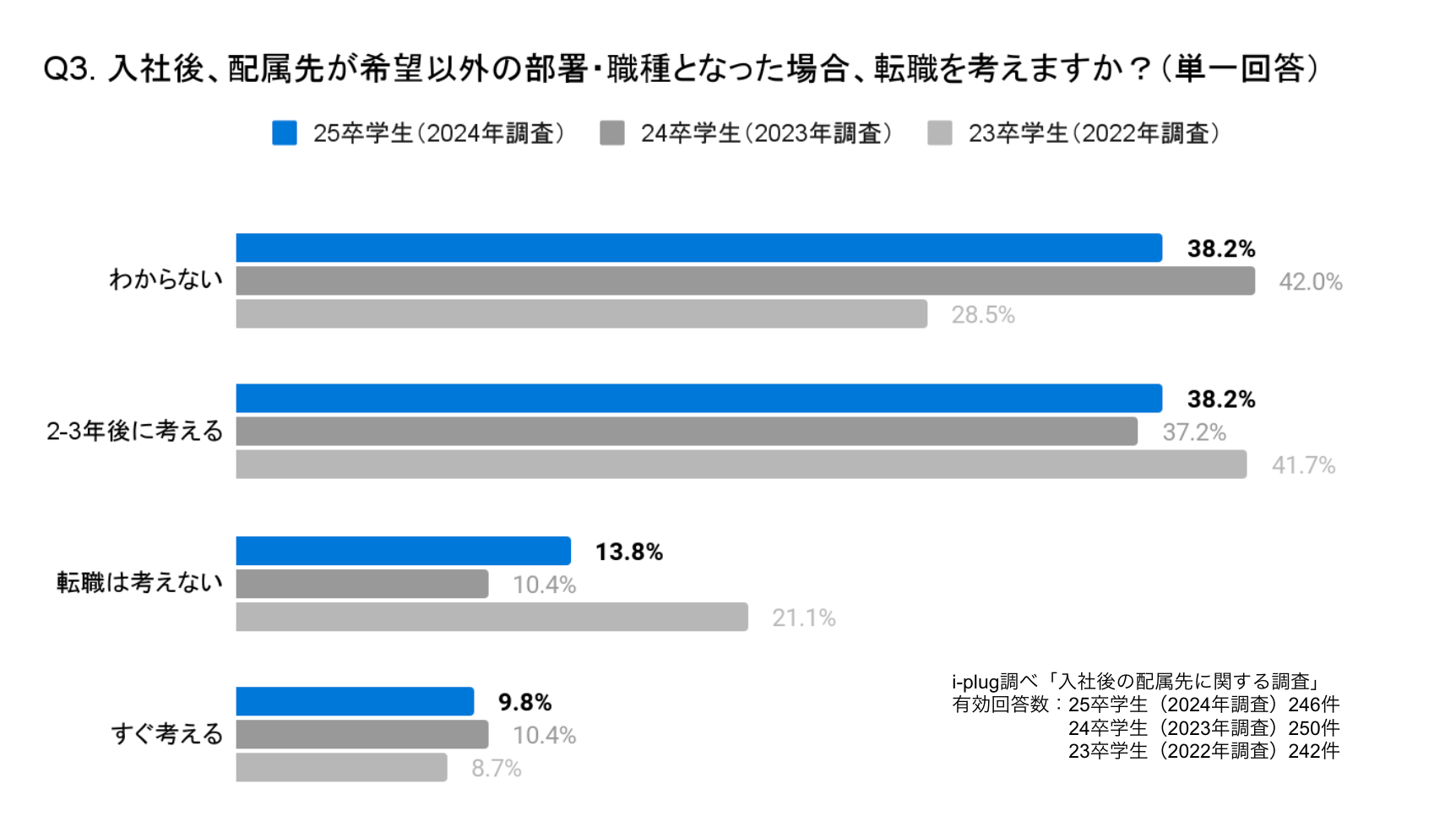 Q3. 入社後、配属先が希望以外の部署・職種となった場合、転職を考えますか?(単一回答/学生対象)