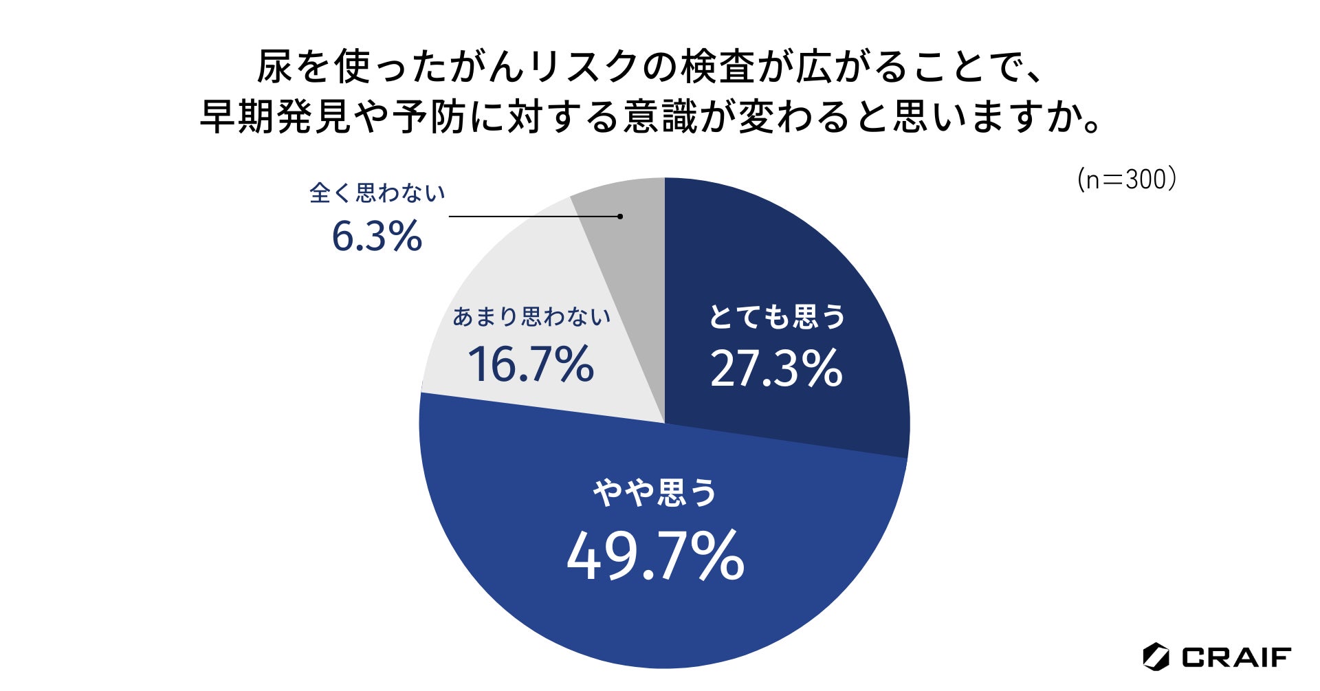 尿を使ったがんリスクの検査が広がることで、早期発見や予防に対する意識が変わると思うか尋ねたところ、「とても思う」と「やや思う」が合わせて77.0%と、約8割が肯定的であることがわかりました(n=300)。