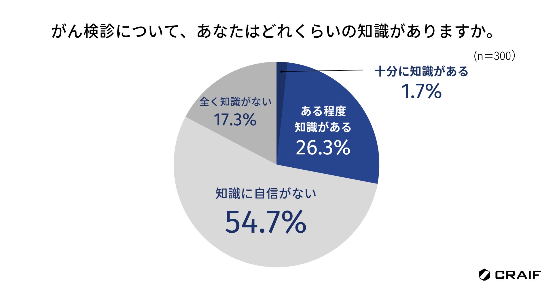 がん検診についてどれくらいの知識があるか尋ねたところ、「知識に自信がない」が54.7%、「全く知識がない」が17.3%で、合わせて7割以上が知識に自信がないと感じていることがわかりました(n=300)。