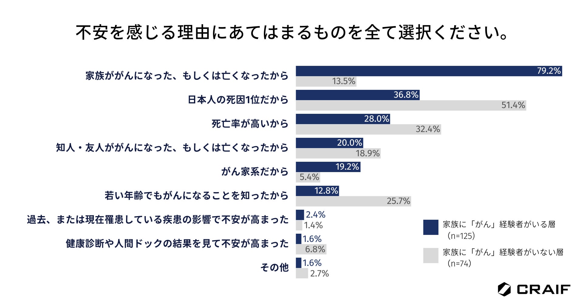 また、家族のがん経験者有無別でがんに対する不安の理由を見てみると、家族にがん経験者がいる層は「家族ががんになったから」が79.2%、家族にがん経験者がいない層は「日本人の死因1位だから」が51.4%でそれぞれ最多となり、不安を感じる理由に違いがあることがわかりました(n=199)。