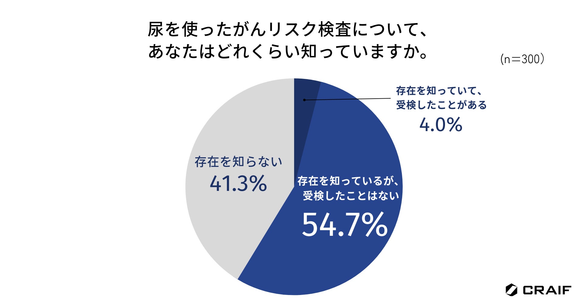 尿を使ったがんリスク検査について尋ねたところ、「存在を知っていて、受検したことがある」が4.0%、「存在を知っているが、受検したことはない」が54.7%で、合わせて約6割が検査の存在を知っているという結果になりました(n=300)。