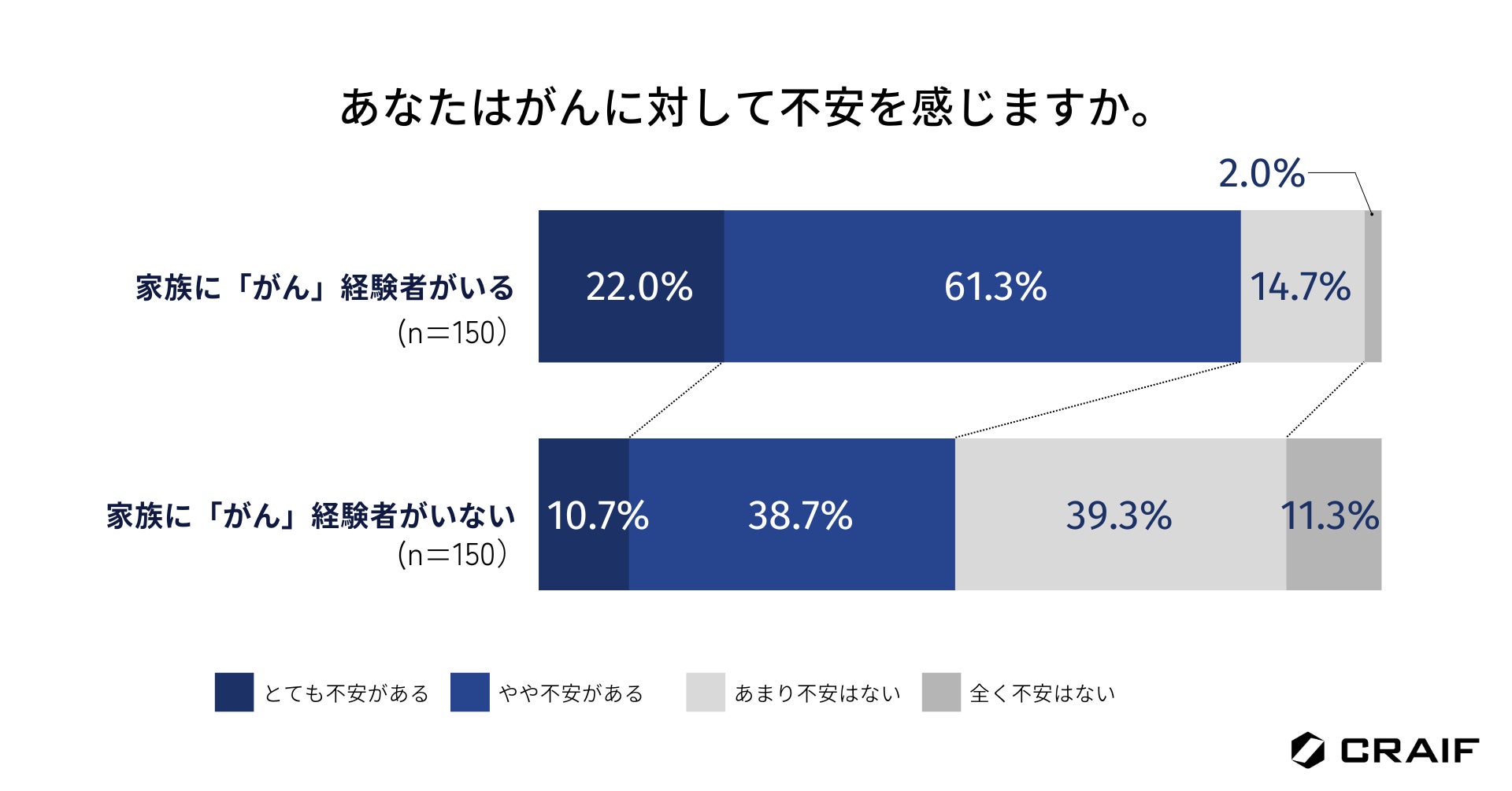 家族にがん経験者がいる層の8割以上が、がんに対して「不安がある」と回答。一方で家族にがん経験者がいない層は半数未満
