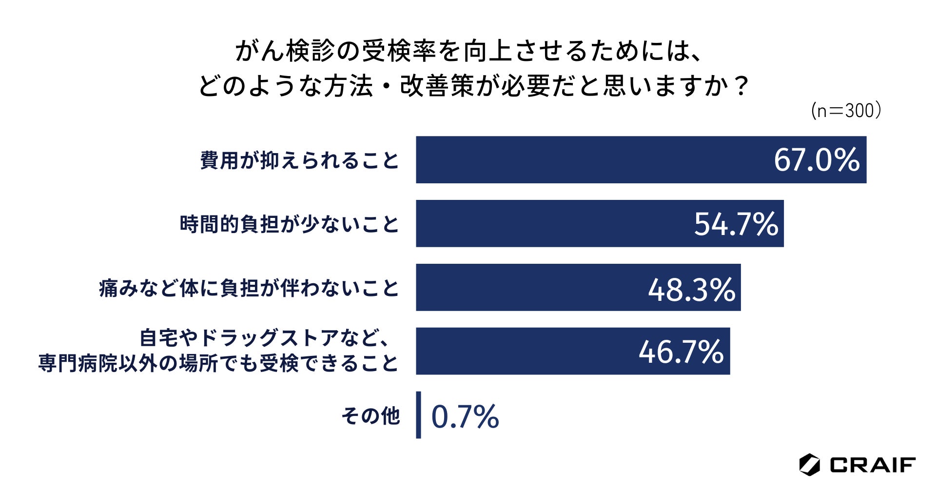 がん検診の受検率を向上させるためには、どのような方法・改善策が必要だと思うか尋ねたところ、「費用が抑えられること」が67.0%と最も多く、「時間的負担が少ないこと」が54.7%、「痛みなど体に負担が伴わないこと」が48.3%と続きました(n=300)。