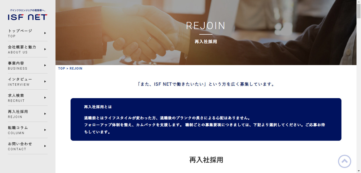 そしてこの度、復帰を後押しする仕組みとして、弊社中途採用サイト( https://www.career.isfnet.co.jp/ )内に「再入社採用特設ページ」を制作しました。