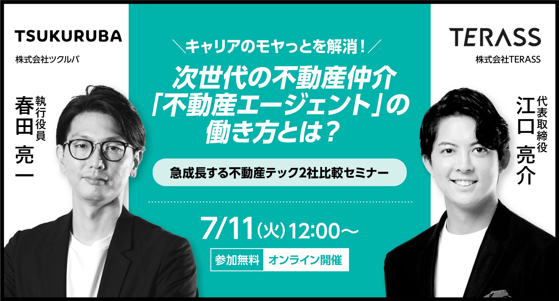 株式会社ツクルバ(本社:東京都目黒区、代表取締役CEO:村上浩輝、以下「ツクルバ」)と株式会社TERASS(本社:東京都港区、代表取締役:江⼝亮介、以下「TERASS」)は、初めて共催し、不動産営業職のネクストキャリアを考える人などを対象に、「不動産エージェント」の働き方をテーマにしたオンラインキャリアセミナーを7月11日(火)に開催致します。