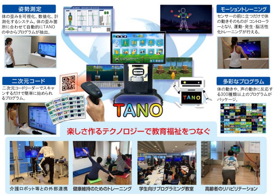 またTANOには、「リハビリ・レクリエーション・測定」など、約300種類以上のプログラムがあり、非接触・非装着で楽しく取り組むことが可能です。これらのコンテンツは、現場の理学療法士や専門家の意見をもとに開発されており、福祉施設、病院、大学、研究機関、商業施設などで幅広く利用されています。