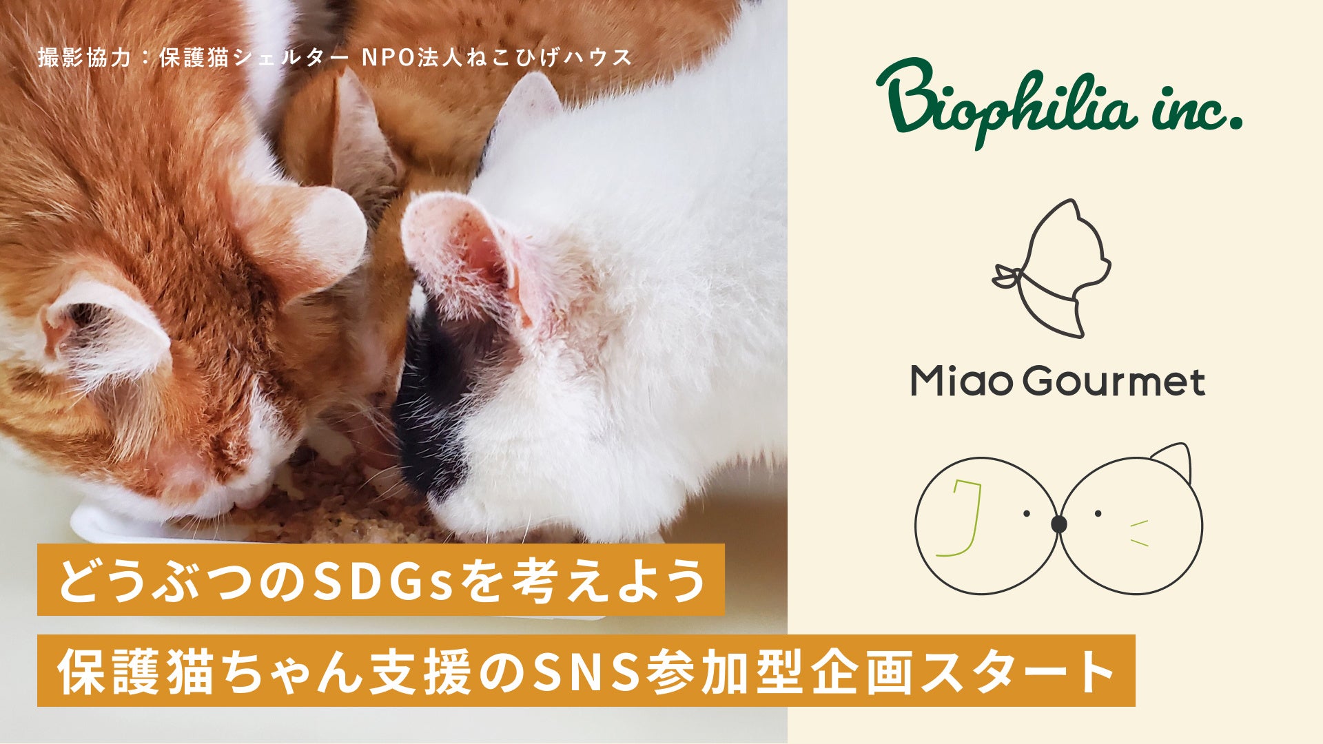 愛犬用手作りごはんブランド「CoCo Gourmet(以下:ココグルメ)」、愛猫用手作りごはんブランド「Miao Gourmet(以下:ミャオグルメ)」を開発・販売する株式会社バイオフィリア(本社:東京都新宿区、代表:岩橋洸太、以下:当社)は、3月17日の「3(み)んなで17のゴールについて考える」SDGsを考える日に合わせ、ミャオグルメの各SNSアカウントをフォローまたは該当投稿を拡散するだけで、おいしく健康的なごはん「ミャオグルメ」を保護猫に贈ることができる参加型の寄付キャンペーンを実施します。キャンペーンを通じて集まったミャオグルメは、当社から動物愛護関連団体様へ寄付させていただきます。一人でも多くの人が動物福祉について知り、考え、行動するきっかけとなるよう、キャンペーンへのご参加、拡散にご協力をお願いします。