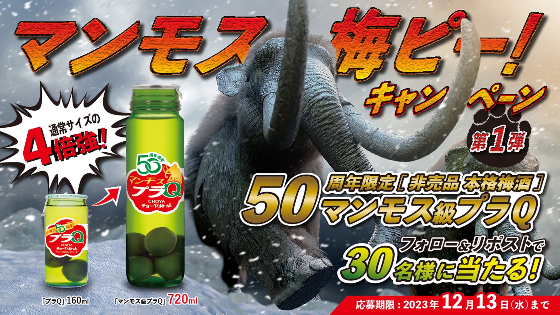 さらにプラQ発売50周年を記念して、X(旧 Twitter)でCHOYA公式アカウントをフォロー&投稿をリポストで、非売品の「マンモス級プラQ」が当たる!キャンペーンを実施いたします。通常の4倍以上とたっぷり楽しめるマンモス級サイズのプラQが、抽選で30名様に当たります。