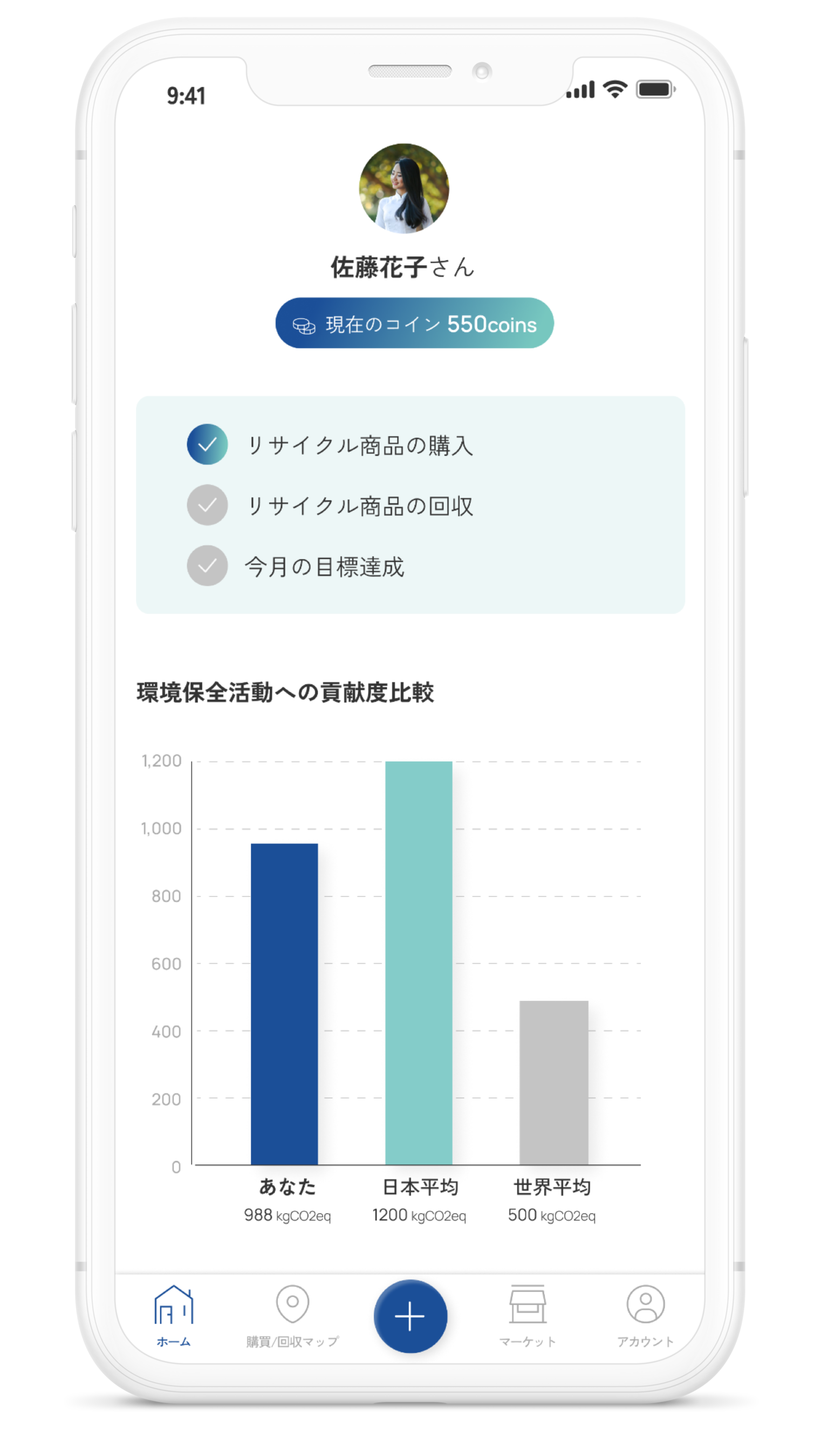 環境に配慮した商品を購入することや、容器の回収に協力することは、生活者が「環境負荷の低い選択をした」「リサイクルに貢献した」という価値を持ちます。同取り組みでは、リサイクル素材を採用した包装容器などに入った商品を購入した場合に、その購買行動をデータとして記録し、個人の貢献を「環境価値」としてアプリケーション上で可視化します。