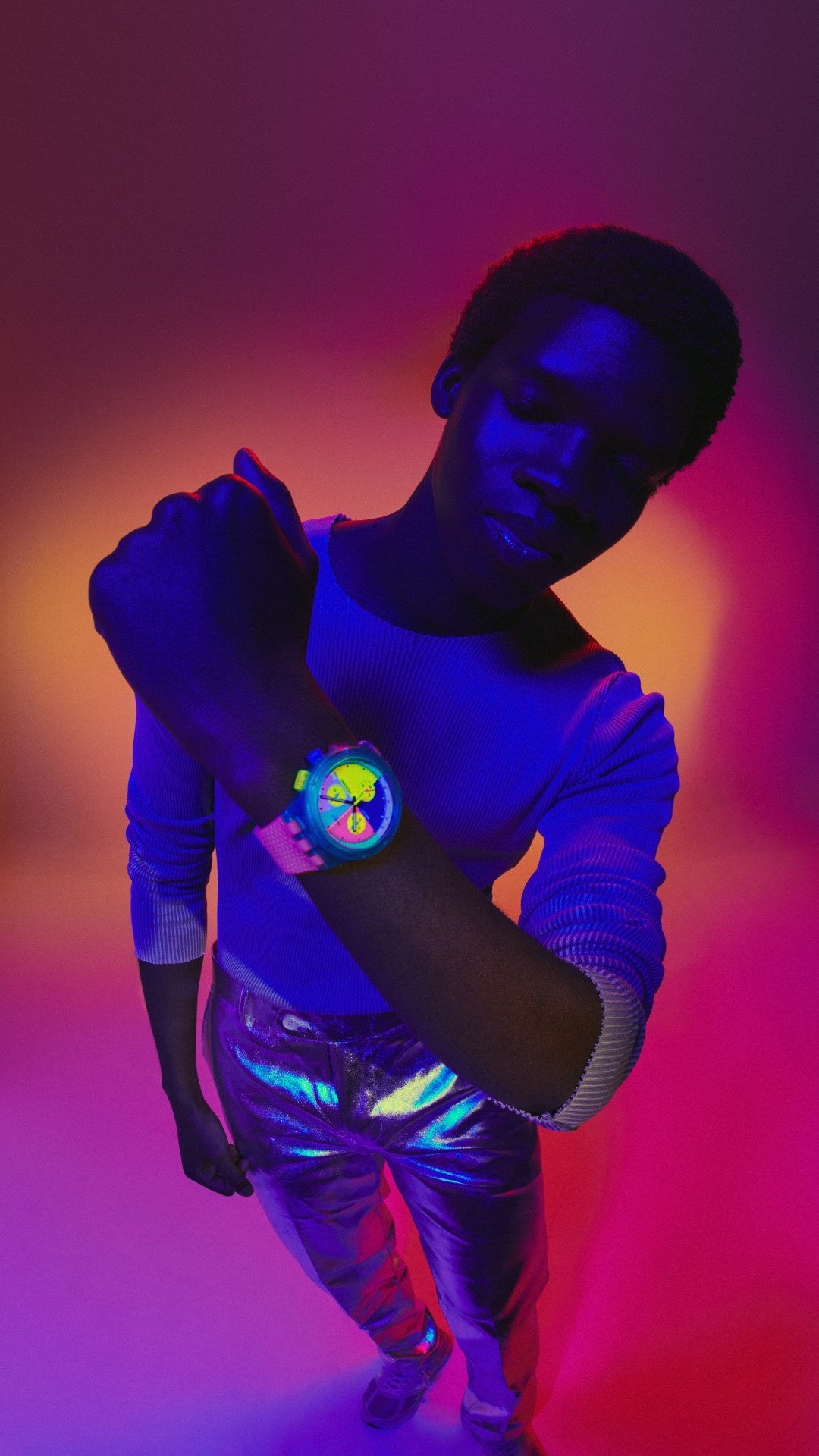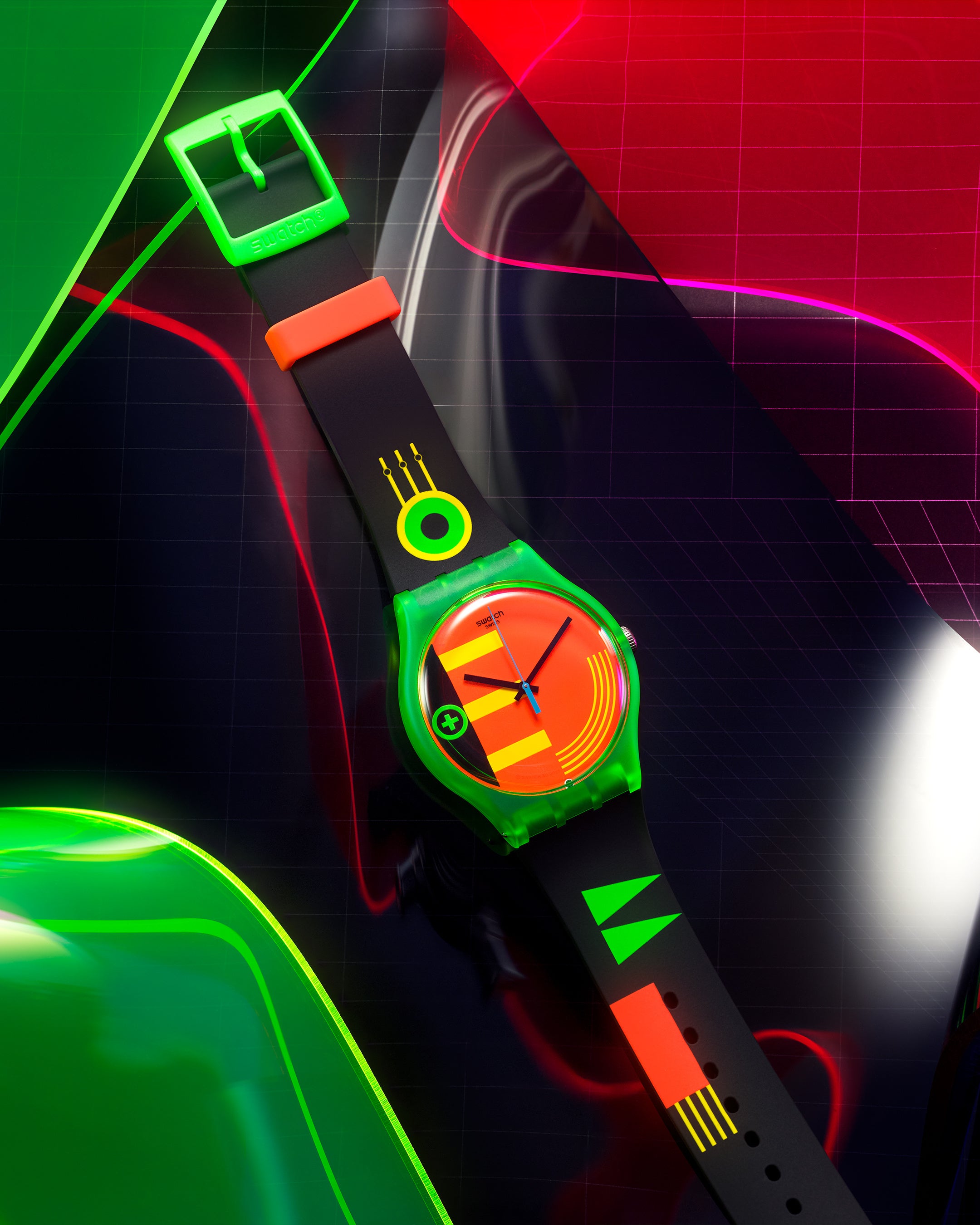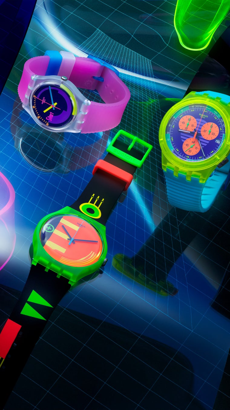 フレッシュなルックの6つの新しいSwatch NEONコレクションは、80年代と90年代の解放的な挑発を表現しています。