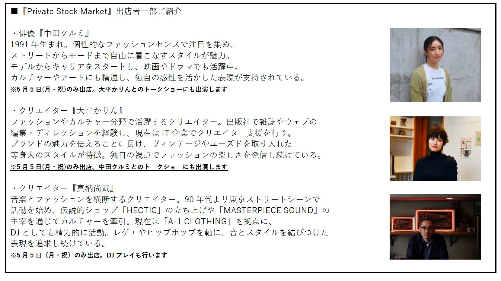 5月5日(月・祝)は、『TRUNK(HOTEL)』のスペシャルPOP UPと同時開催となる他、俳優『中田クルミ』とクリエイター『大平かりん』が登場するトークイベントも開催するなど、GWの締めくくりに相応しい賑やかな一日となります。