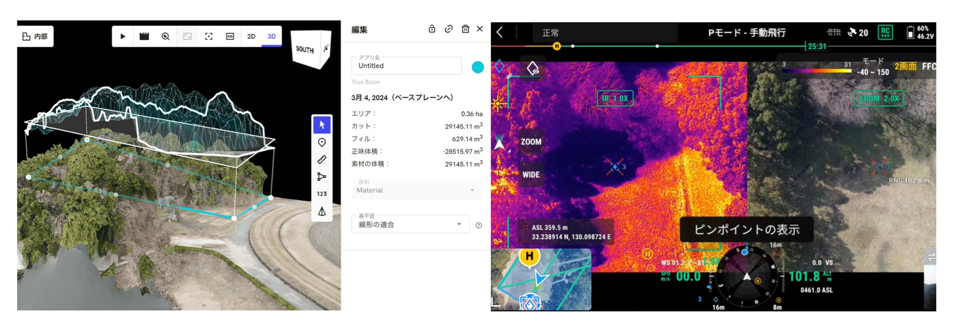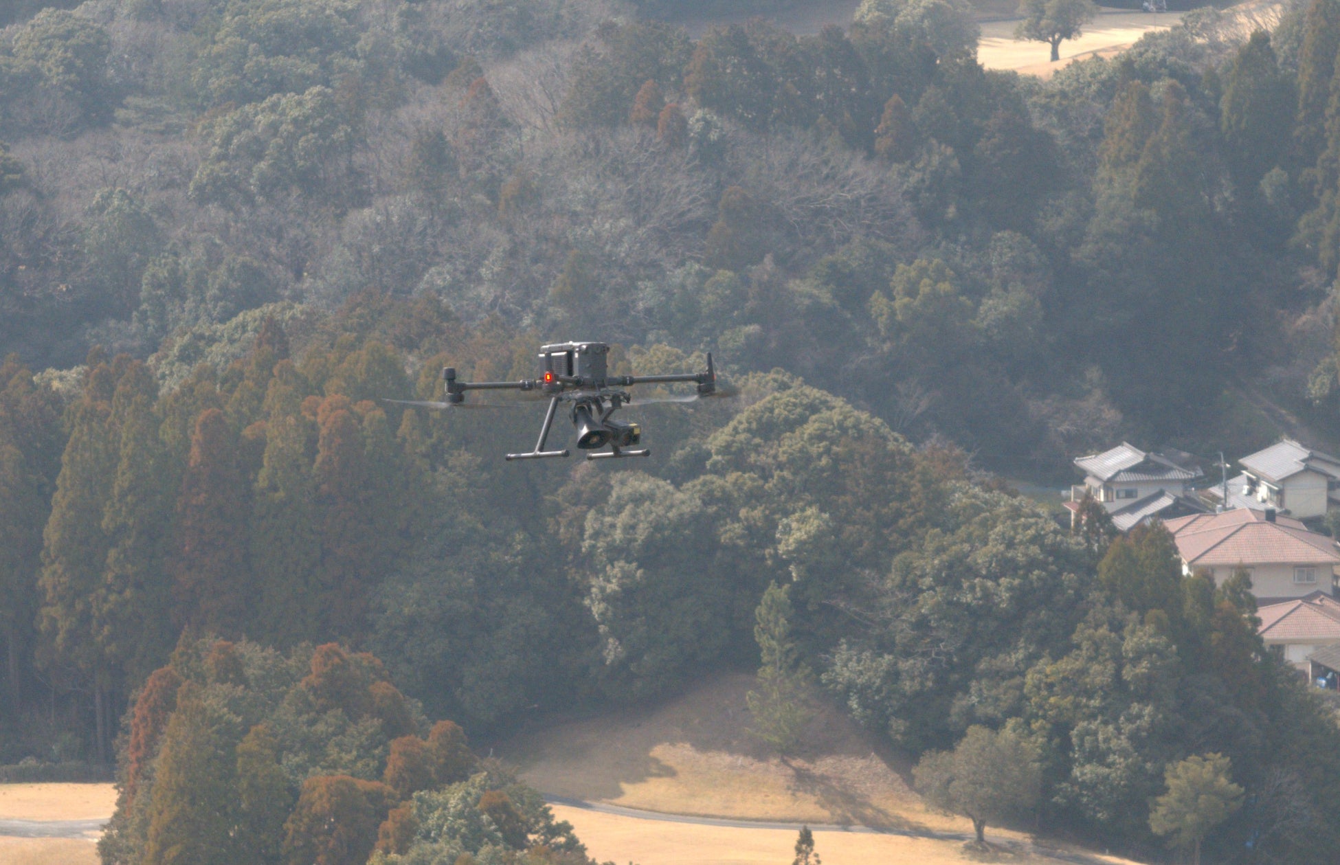 多久市中央公園にて、災害発生後に土砂崩れが起こったと想定し、被害状況確認の為にドローンによる簡易測量で三次元データを作成しました。またドローンに積載したスピーカーを使用し、付近へ近づかないようアナウンスする実験を行いました。その後サーモカメラにて被災者の熱を感知し、対象への指示を出しました。投資家の皆様と佐賀県や多久市の職員にその様子を見学いただき、多くの質問をいただきました。