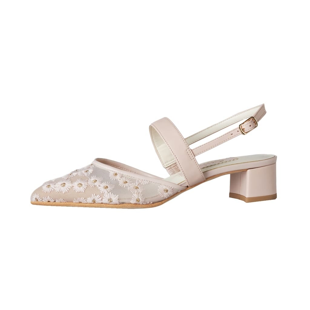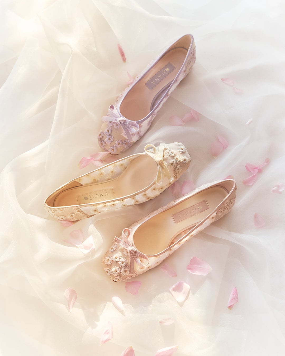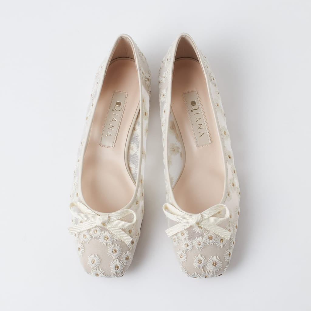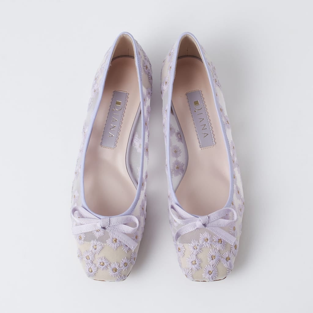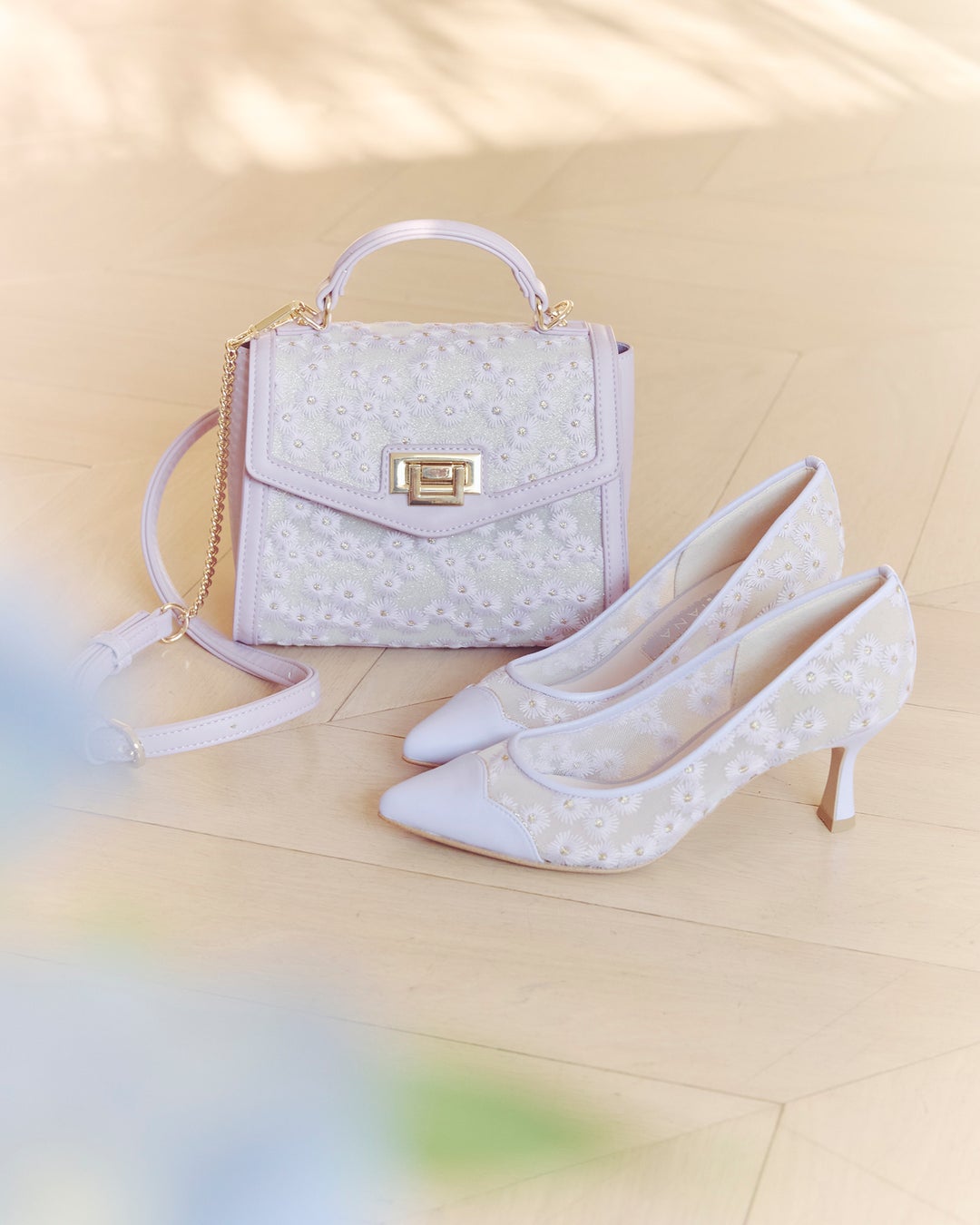 今回のコレクションでは、デイジーの刺繍が可憐な印象のシューズ3モデル、バッグをご用意いたしました。