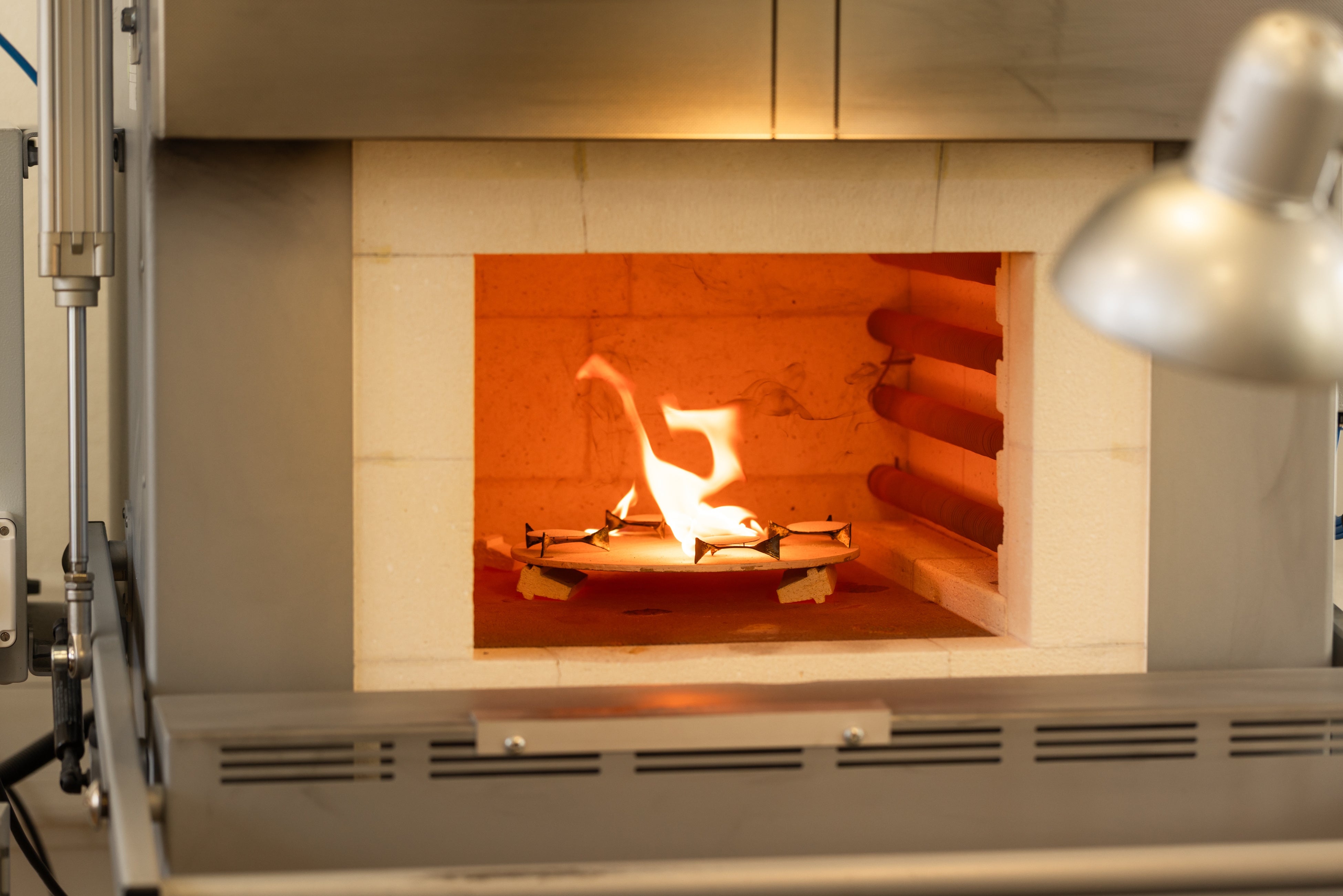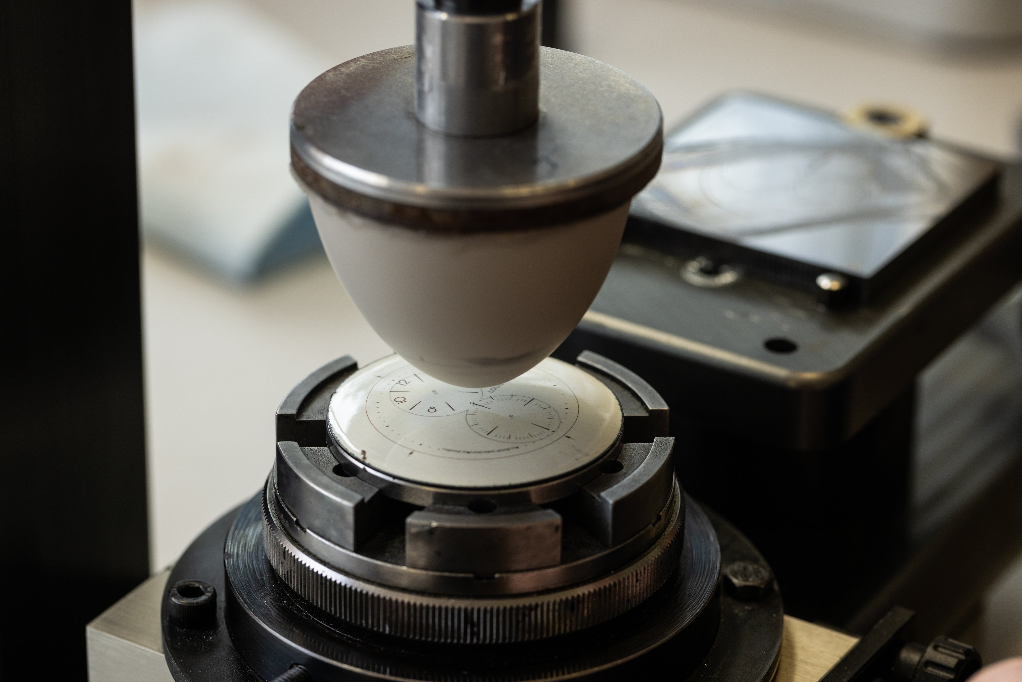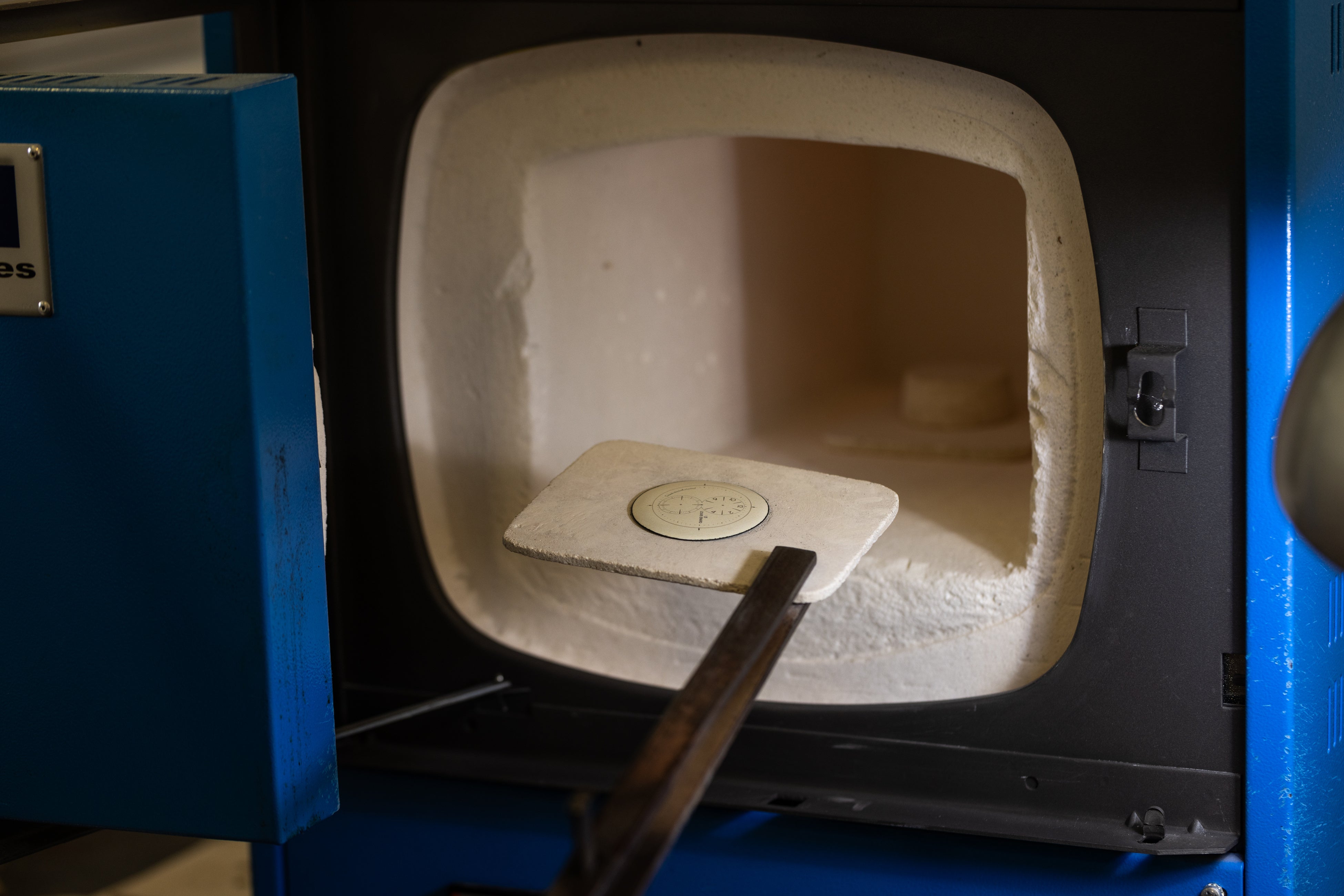 800度程度の高温で焼成→エナメルパウダー塗布を6回から8回繰り返します。窯にいれた際に上がる炎がGrand Feu(偉大な炎)の名前の由来です。焼きあがった文字盤は割れないようにゆっくり冷やし安定させます。
