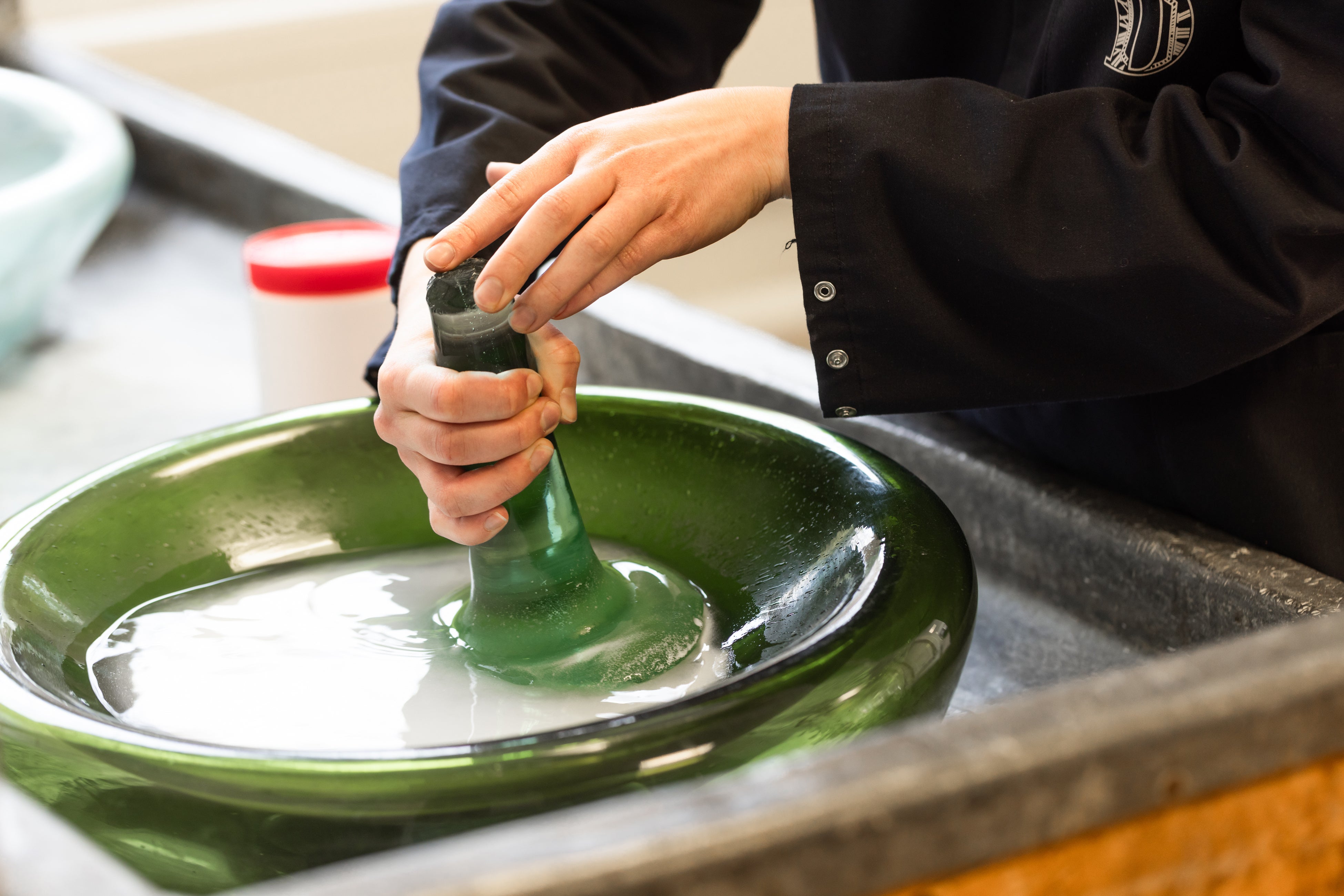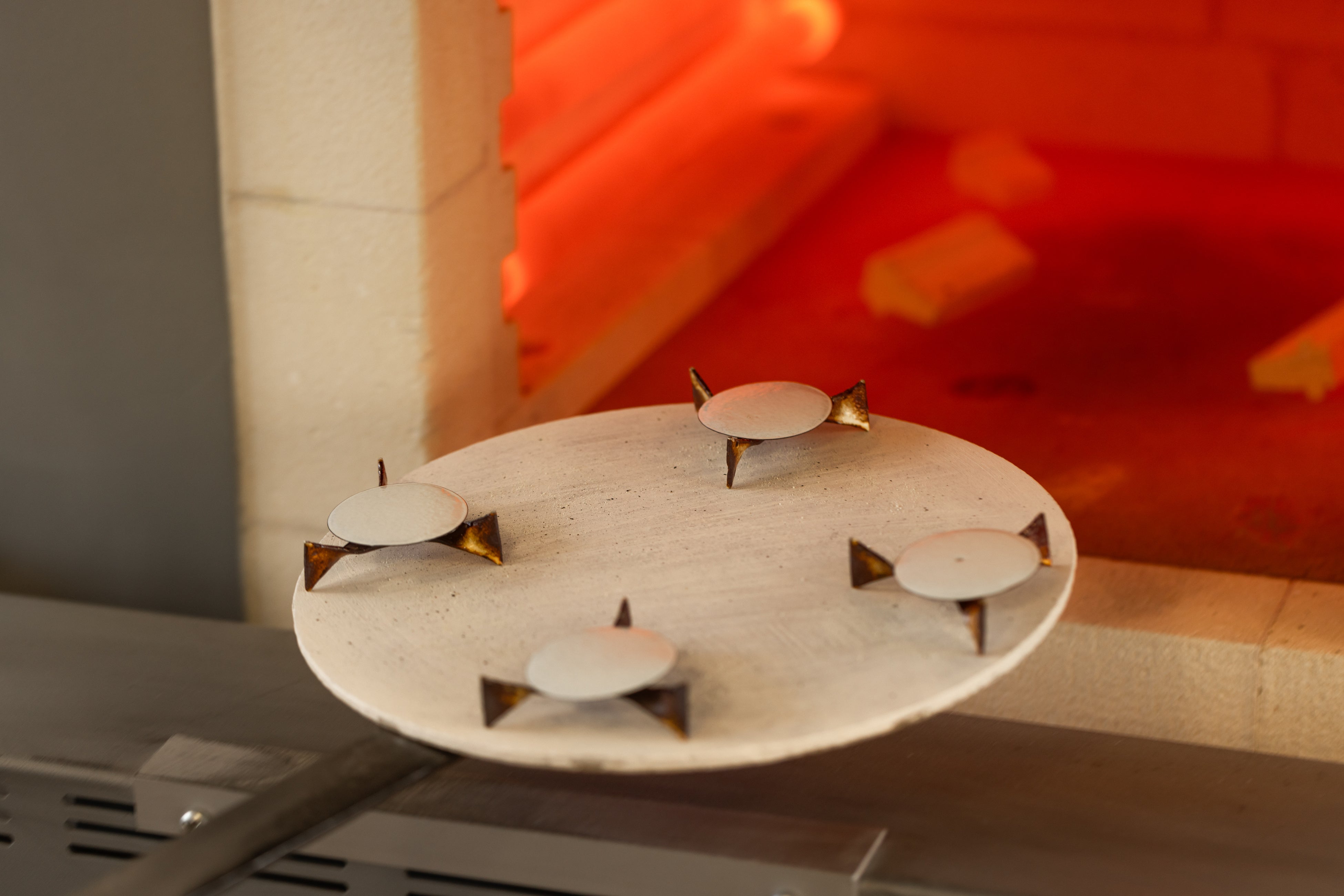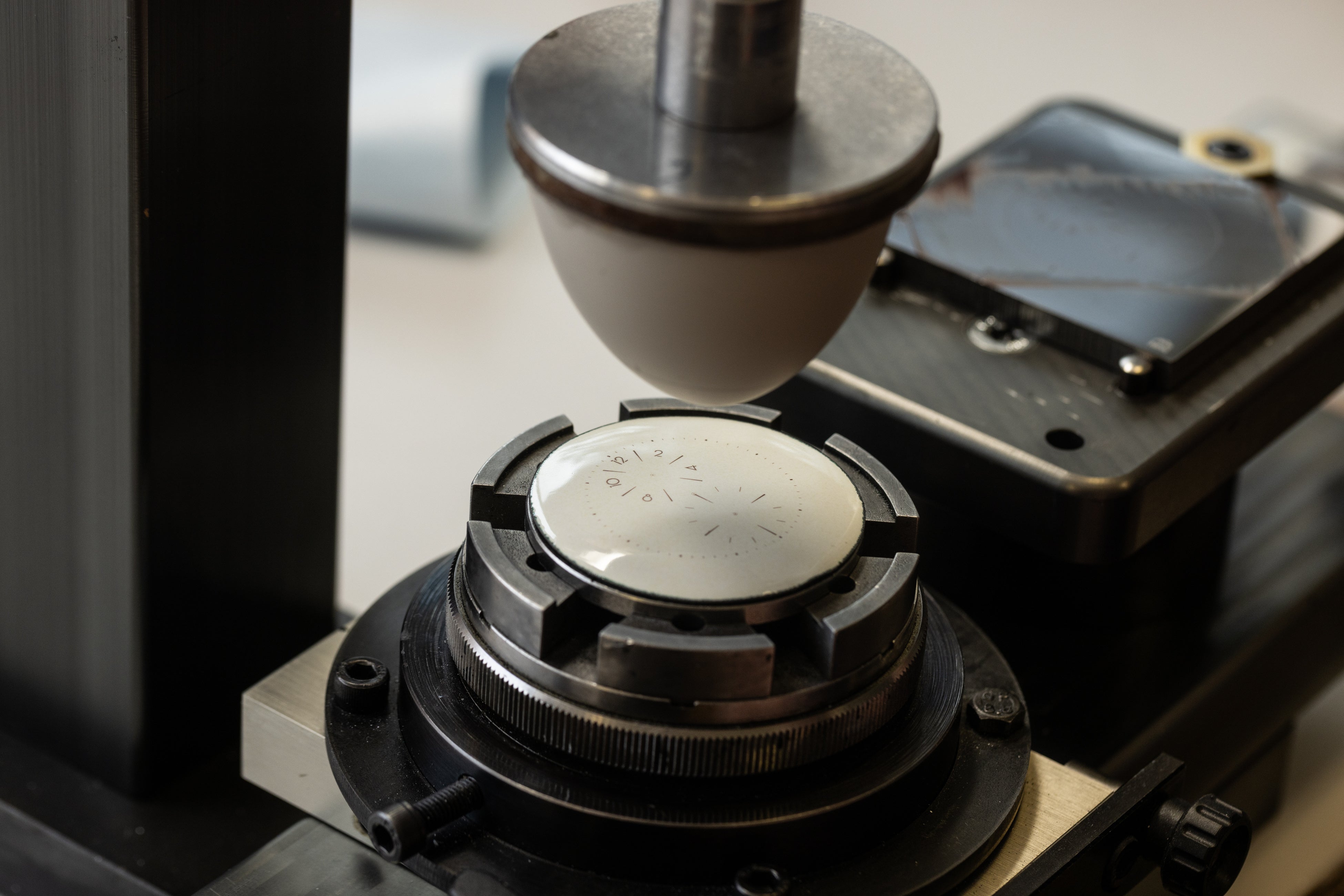 800度程度の高温で焼成→エナメルパウダー塗布を6回から8回繰り返します。窯にいれた際に上がる炎がGrand Feu(偉大な炎)の名前の由来です。焼きあがった文字盤は割れないようにゆっくり冷やし安定させます。