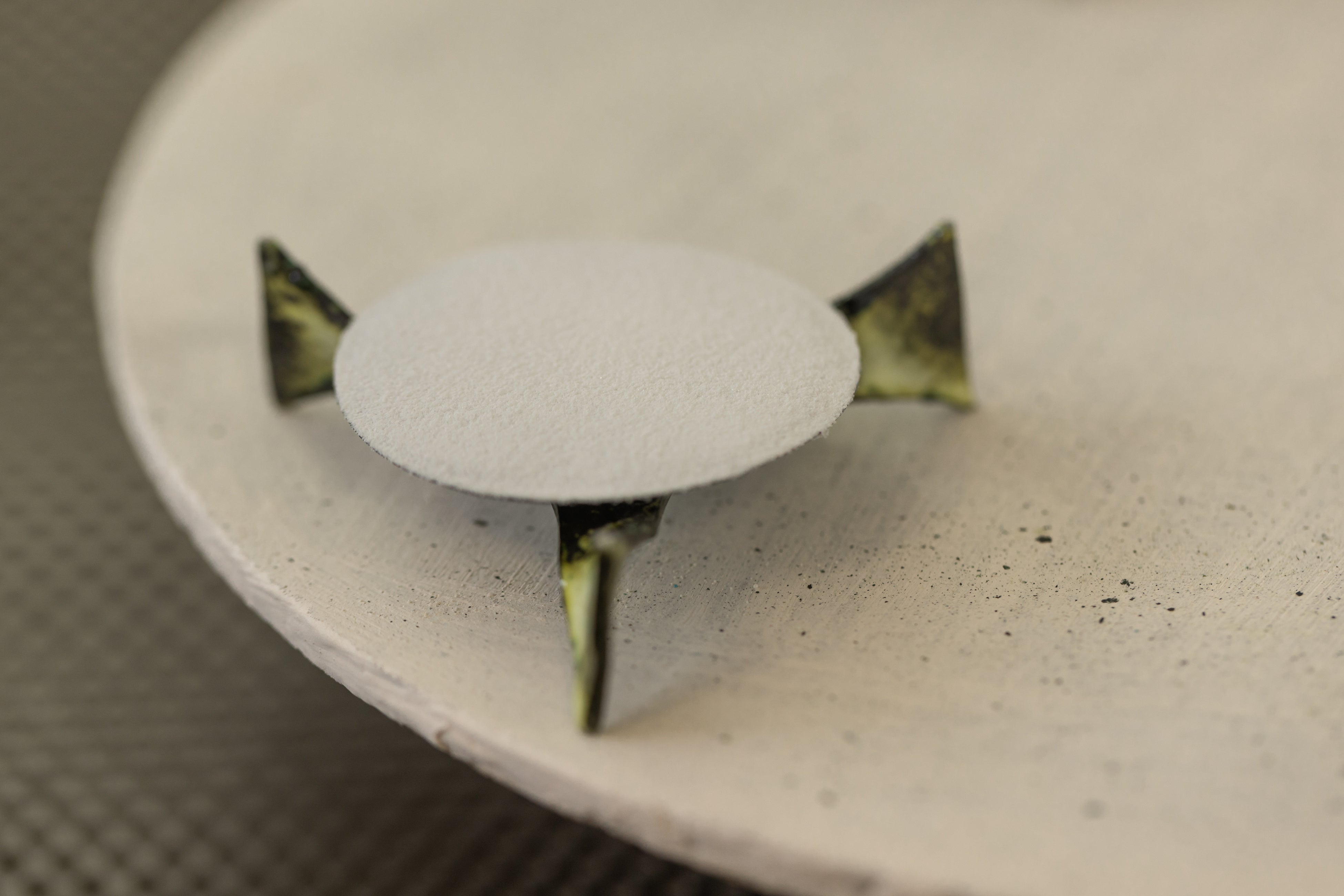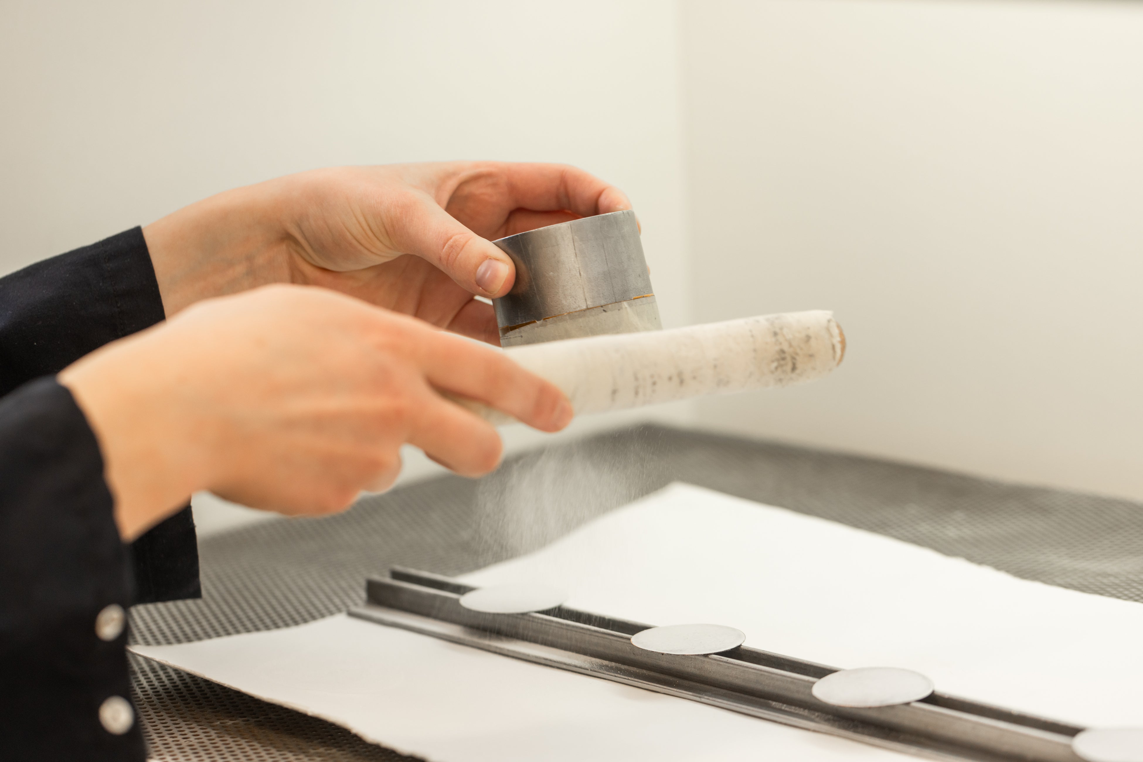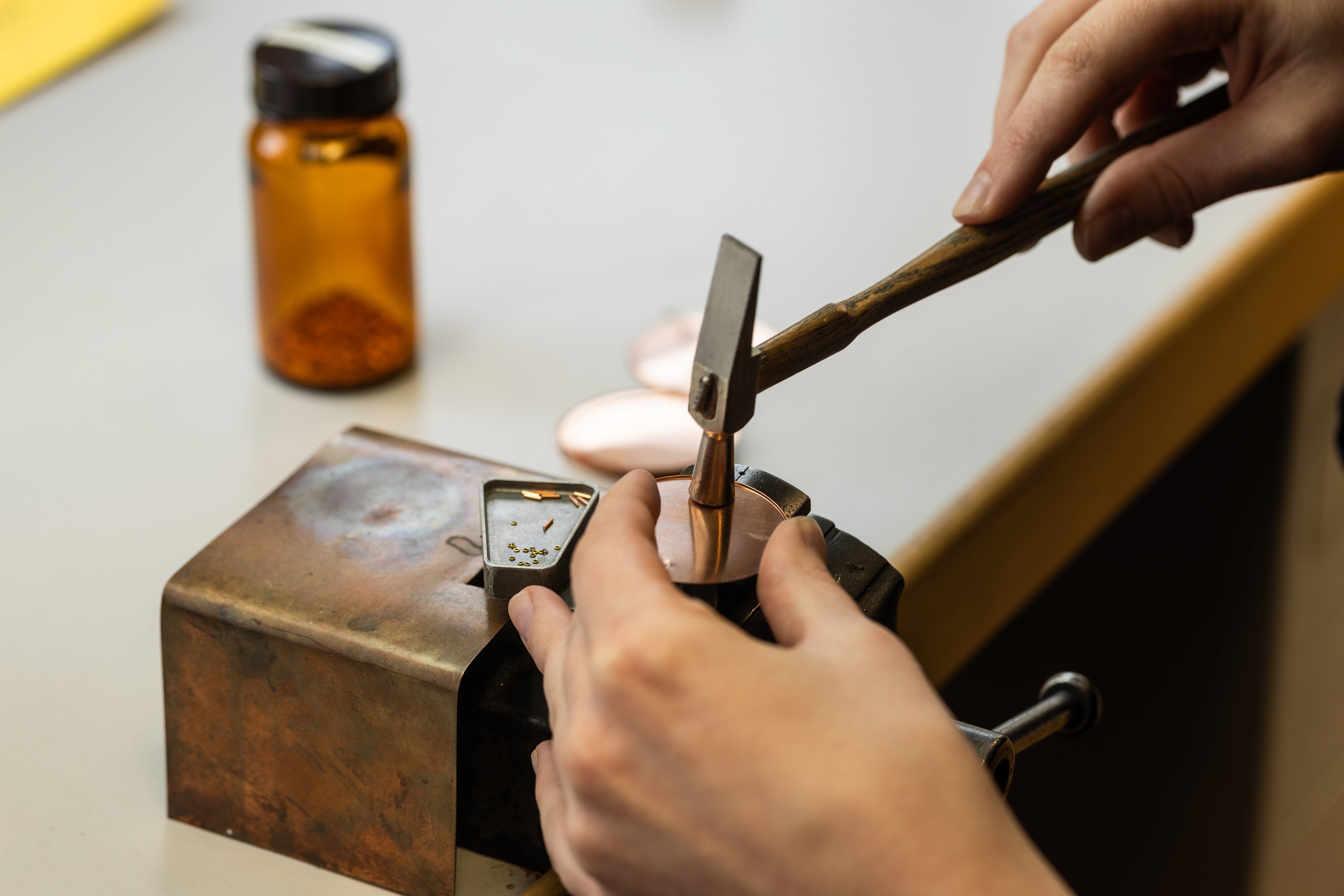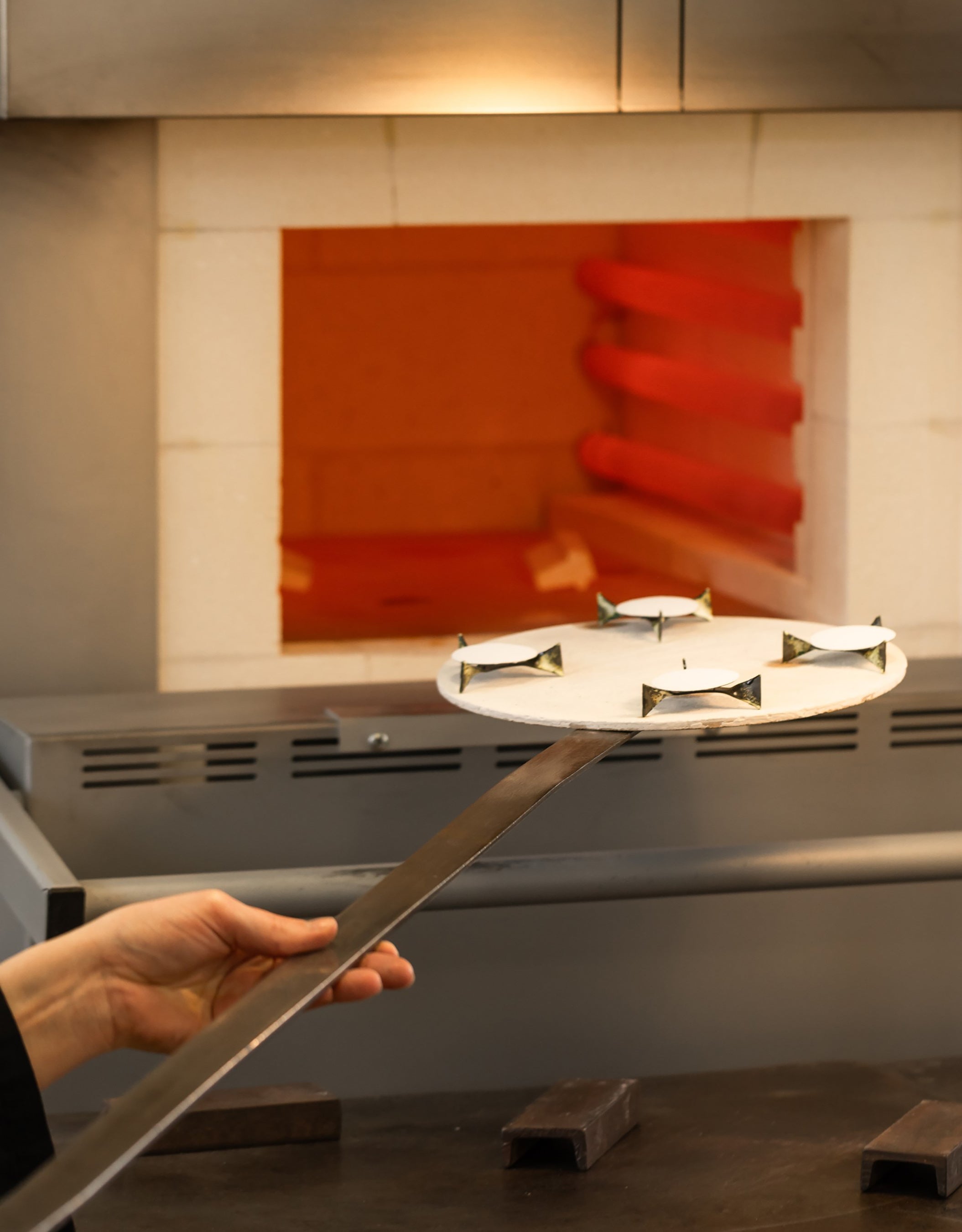 柔らかい銅板から打ちぬかれた文字盤のベースに足を取り付けた後に酸性液につけ酸化させます。盤上に水で混ぜたエナメルパウダーをのせ窯にいれ焼成します。ベースに銅板を使用するのはエナメル本来の柔らかい白を出すためです。