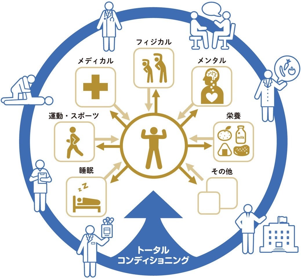 コンディショニングを効果的に実践するためには、自分一人で取り組むだけではなく、身近な人たちの協力や専門家のサポートが欠かせません。それぞれの立場の人たちが協力・協調して連携を組み、包括的な活動を行うことを「トータルコンディショニング」といい、ウェルビーイングを実現するための新たな概念です。