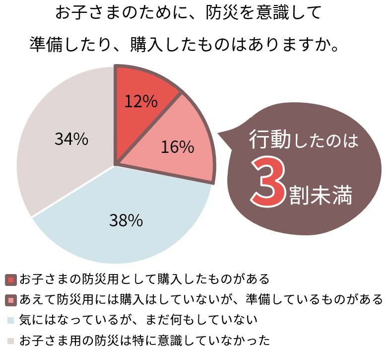 当社が2021年に妊娠中から1才6ヵ月までのお子さまがいる全国のパパ・ママを対象に実施した調査※では、「災害に対して、どの程度不安を感じていますか」という質問に対して8割以上が「とても不安」「やや不安」と回答。また、子どもが生まれて、もしくは妊娠をきっかけに「防災意識に関心が高まった」と回答したパパ・ママは約7割もおりました。その一方で、「お子さまのために防災を意識して準備したり、購入したものはありますか」という質問では、「購入したものがある」「あえて防災用には購入していないが、準備しているものがある」、つまり何かしらの「行動」に移したと回答したパパ・ママは28%と3割にも満たない結果となりました。