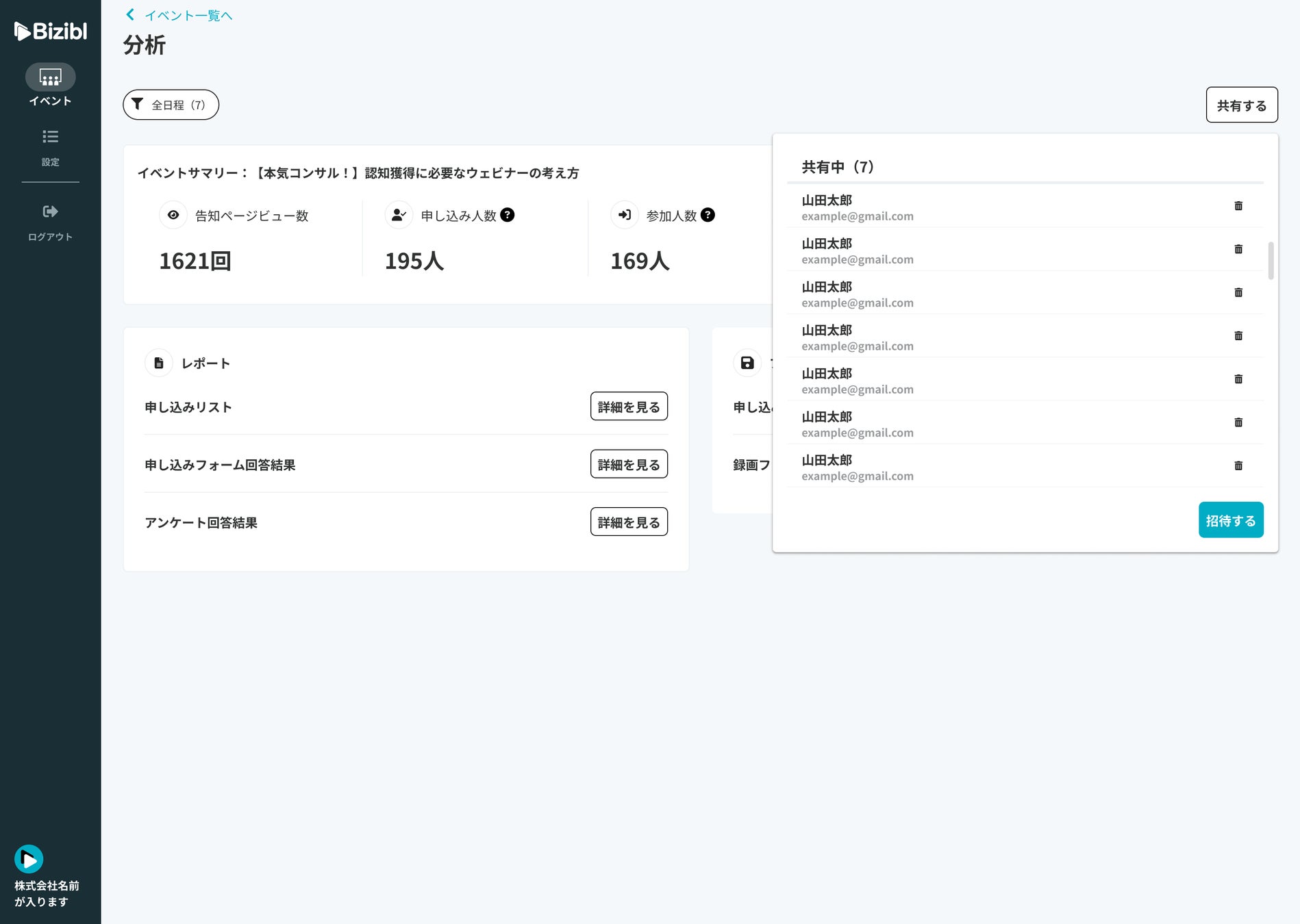 この課題を解決するために、「Bizibl」は新機能「共催先へのデータ共有機能」をリリースしました。本機能により、共催先担当者の氏名とメールアドレスを登録し、URLを送付するだけで、上記のデータの最新状況を簡単に共有できるようになります。