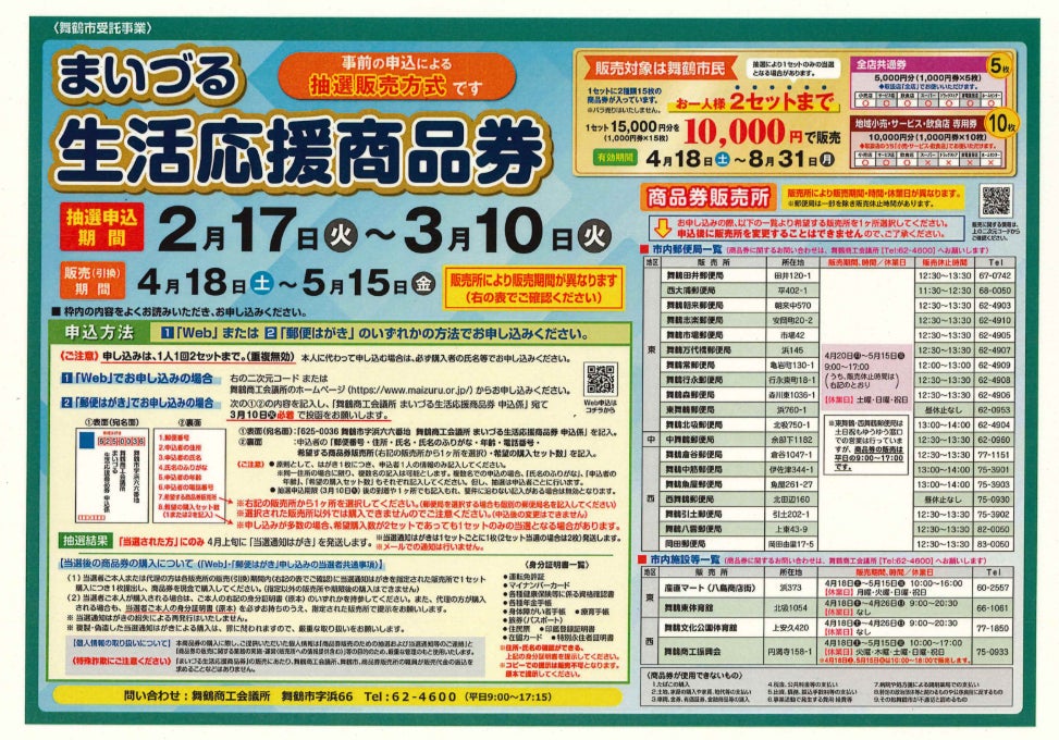 舞鶴市は、物価高騰の影響を受ける市民の生活支援と地域経済の活性化を目的に、市内店舗で使用できる「まいづる生活応援商品券」の抽選申込みを令和8年2月17日(火)より開始します。