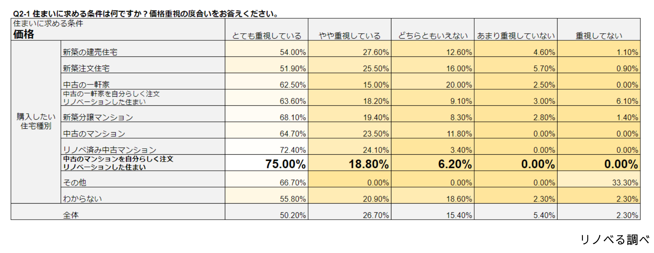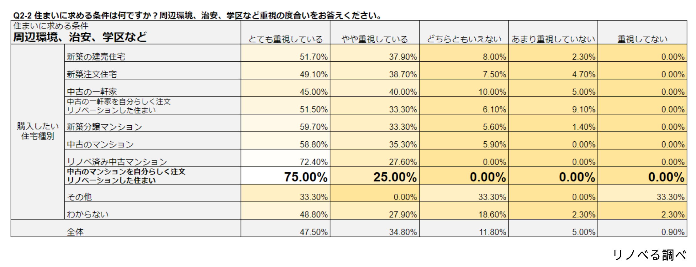 住まいに求める条件は、購入したい住宅種別によって変化するのでしょうか?「新築の建売住宅」「新築注文住宅中古の一軒家」「中古の一軒家を自分らしく注文リノベーションした住まい」「新築分譲マンション」「中古のマンション」「リノベ済み中古マンション」「中古のマンションを自分らしく注文リノベーションした住まい」という7つの住宅種別毎に、住まいに求める条件である「価格」「周辺環境、治安、学区」「駅距離」「間取り」「内装」「広さ」「断熱・省エネ性能」「築年数」「物件の管理状況(耐震性、修繕の状況など)」「資産性」という10個の重要度合いを回答いただきました。