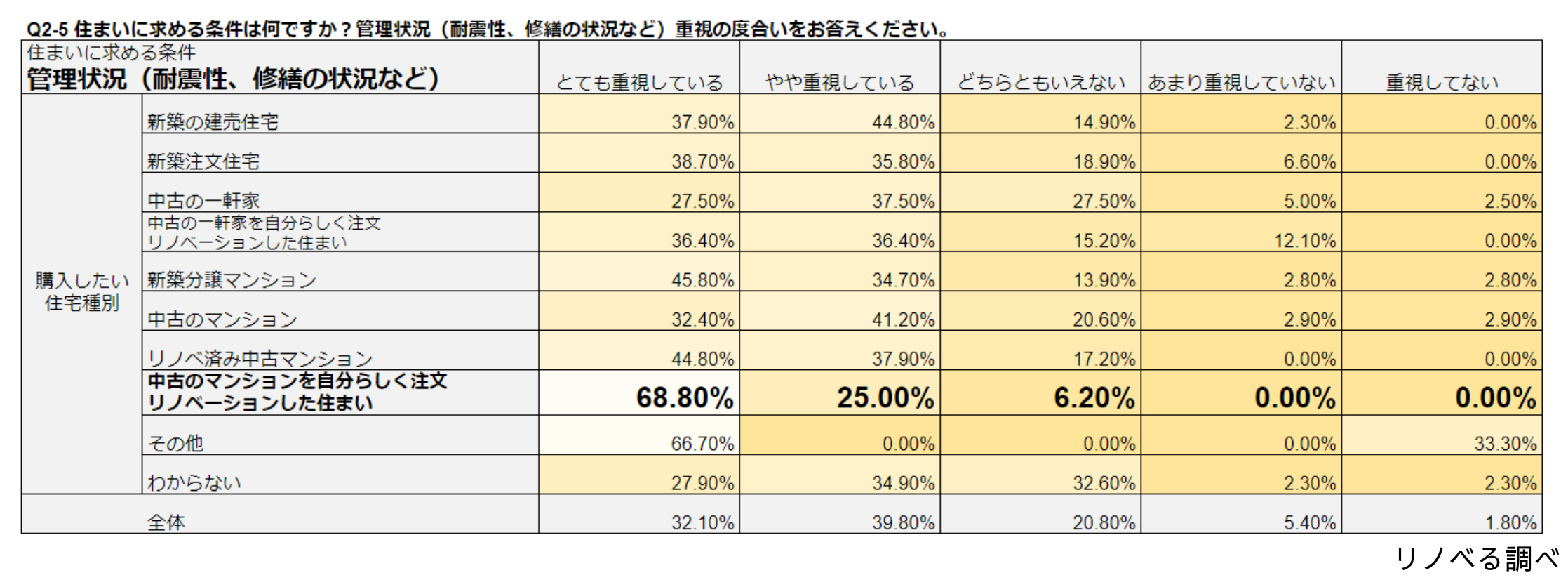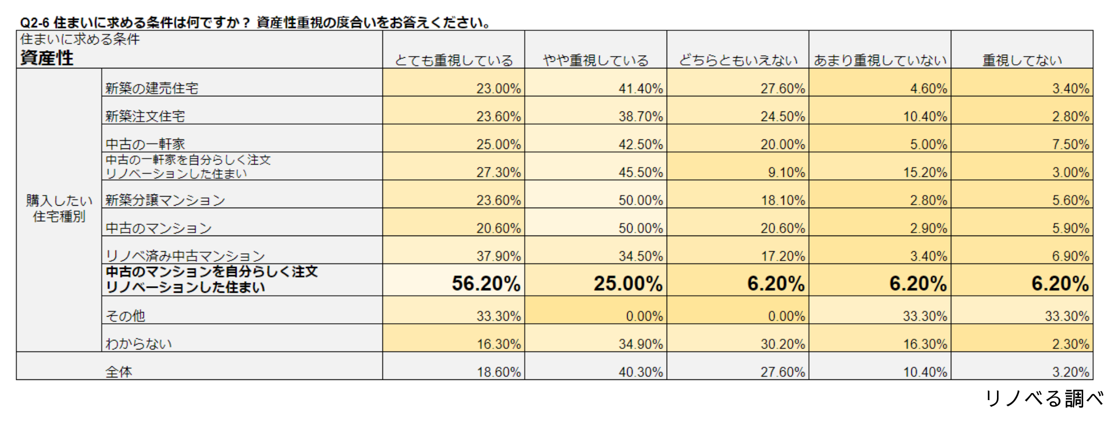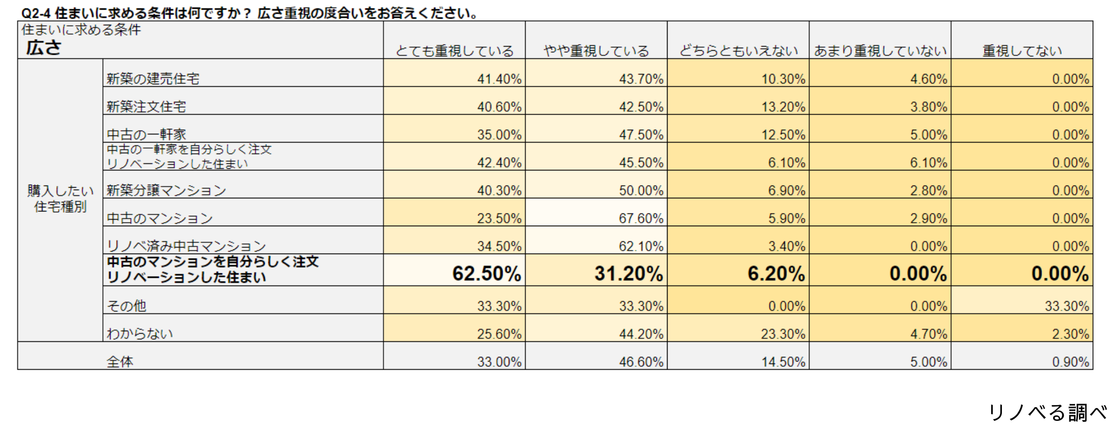 新築、中古、マンション、戸建て、建売、オーダー…住まいの種別毎に、資産性、価格、内装等の住まいに対する重視度合いを聞いたところ、「中古×オーダーリノベ」を選んだ方はどの項目についても「とても重視する」の数値が他の種別より高く、妥協をしないことが判明!