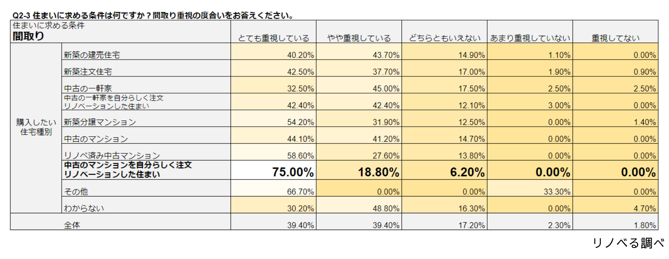 結果としては、「中古のマンションを自分らしく注文リノベーションした住まい」を選択した方が「とても重視している」と回答した割合が全ての項目で高く、特に「価格」「周辺環境、治安、学区」「間取り」は75%でした。これは、新築の選択肢(新築の建売住宅、新築の注文住宅、新築分譲マンション)の平均52.4%と比較しても22.6%高く、新築や建売では叶いづらいリノベーションの強みを映し出す結果となりました。(表の記載は特に数値の高かった6項目)