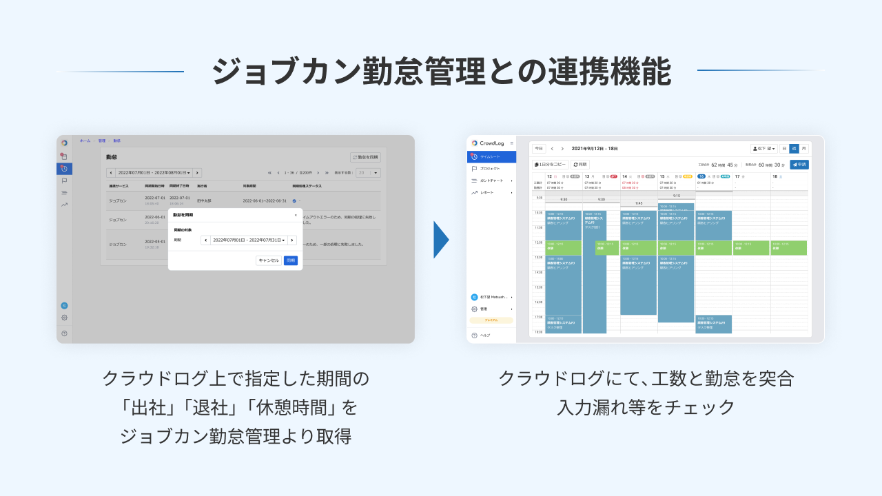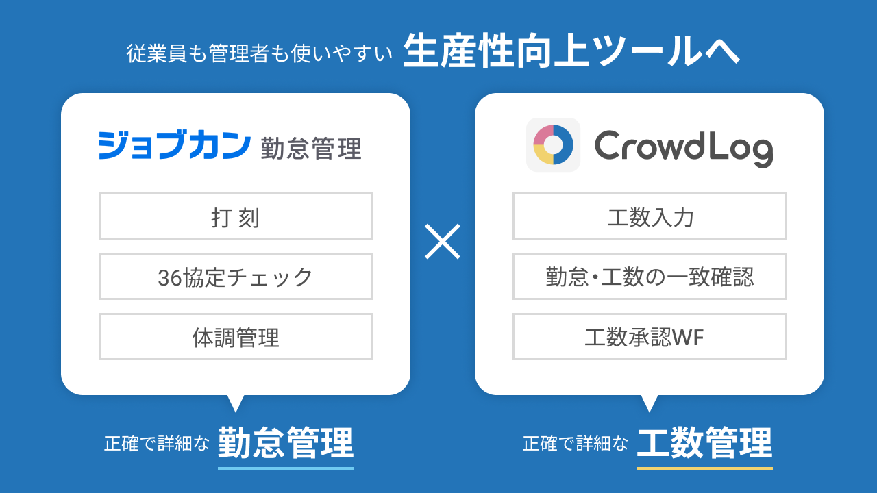そうした中で、クライアント様から、「すでに勤怠管理ツールを導入しているが、工数管理ツールと別の運用になっていて、集計が二度手間で負担が大きい」「ツールが多く、データが複数できあがり、かえって突合するのに手間がかかる」「すでに導入しているツールがあるので、また新しいツールを別に導入するのは負担が大きい」といった声をいただきました。クラウドログは、生産性向上の第一歩として、正確な工数管理・把握を行うことで、より精緻な改善策をご検討いただくベースとなるツールです。ジョブカン勤怠管理との機能連携により、実際の勤怠情報をクラウドログ内で突合できるようになり、より正確なデータに基づいた工数承認ワークフローの構築や、その後の生産性向上施策につなげていただくことが可能となります。