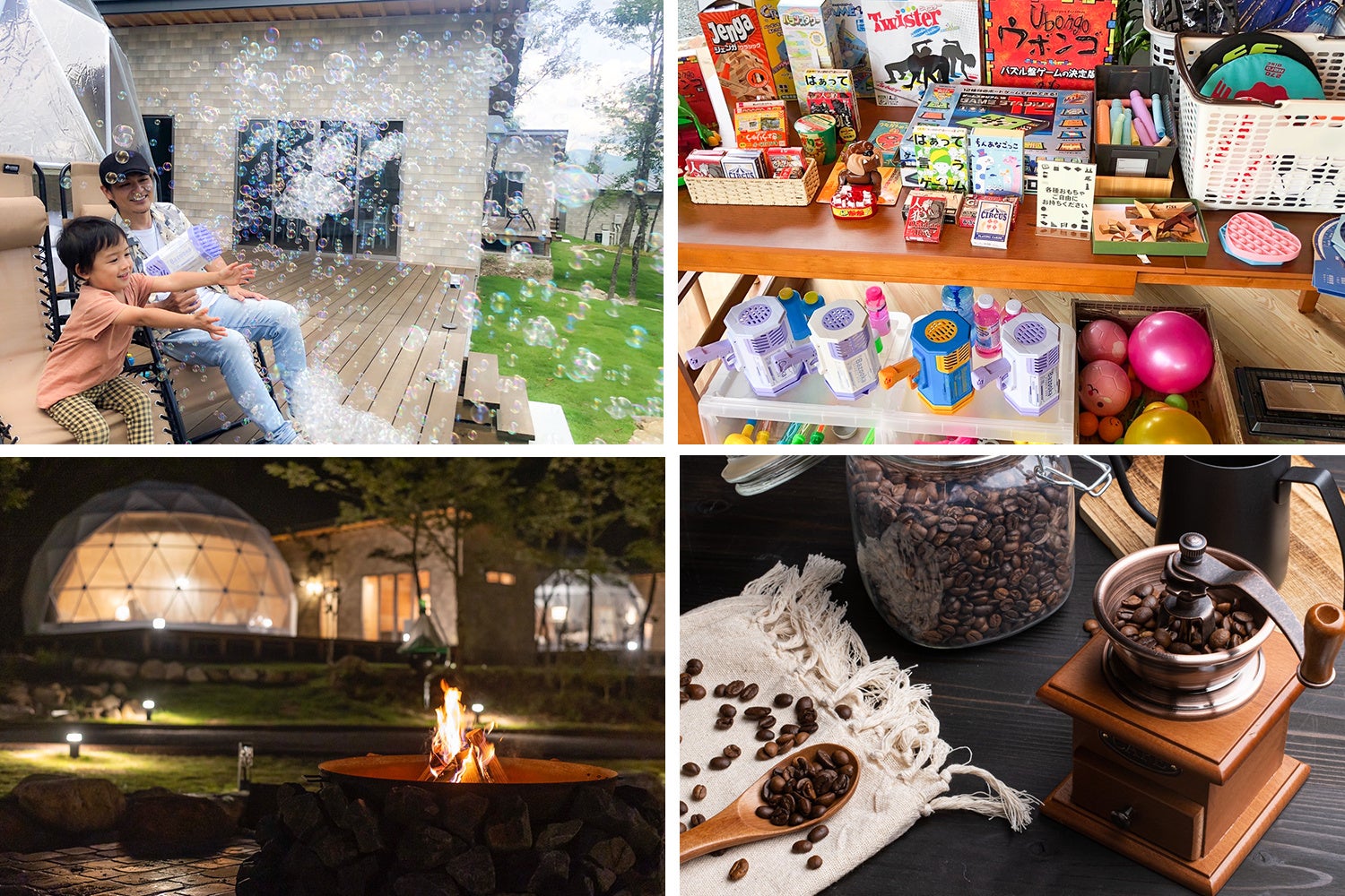 他にもお好みのコーヒー豆を選んで挽きたて香りとともにコーヒーを味わうコーヒーバイキングや、屋外でも室内でも楽しめるゲーム類や、お子様も楽しめる外遊びグッズも豊富に揃えております。